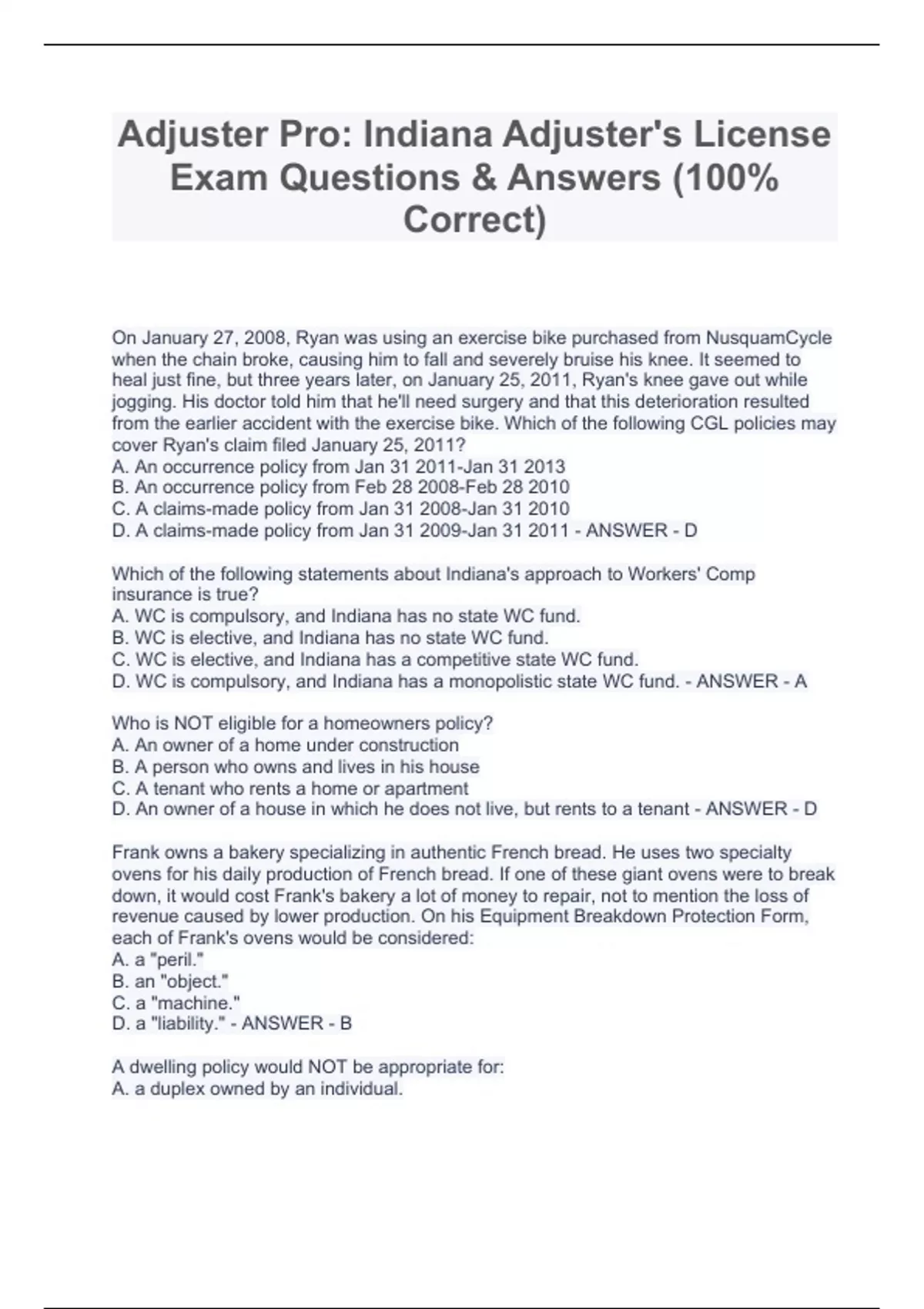 On January 27, 2008, Ryan was using an exercise bike purchased from NusquamCycle when the chain broke, causing him to fall and severely bruise his knee. It seemed to heal just fine, but three years later, on January 25, 2011, Ryan's knee gave out while jogging. His doctor told him that he'll need surgery and that this deterioration resulted from the earlier accident with the exercise bike. Which of the following CGL policies may cover Ryan's claim filed January 25, 2011? A. An occurrence policy from Jan 31 2011-Jan 31 2013 B. An occurrence policy from Feb 28 2008-Feb 28 2010 C. A claims-made policy from Jan 31 2008-Jan 31 2010 D. A claims-made policy from Jan 31 2009-Jan 31 2011 - ANSWER - D Which of the following statements about Indiana's approach to Workers' Comp insurance is true? A. WC is compulsory, and Indiana has no state WC fund. B. WC is elective, and Indiana has no state WC fund. C. WC is elective, and Indiana has a competitive state WC fund. D. WC is compulsory, and Indiana has a monopolistic state WC fund. - ANSWER - A Who is NOT eligible for a homeowners policy? A. An owner of a home under construction B. A person who owns and lives in his house C. A tenant who rents a home or apartment D. An owner of a house in which he does not live, but rents to a tenant - ANSWER - D Frank owns a bakery specializing in authentic French bread. He uses two specialty ovens for his daily production of French bread. If one of these giant ovens were to break down, it would cost Frank's bakery a lot of money to repair, not to mention the loss of revenue caused by lower production. On his Equipment Breakdown Protection Form, each of Frank's ovens would be considered: A. a "peril." B. an "object." C. a "machine." D. a "liability." - ANSWER - B A dwelling policy would NOT be appropriate for: A. a duplex owned by an individual. B. a single-family home who