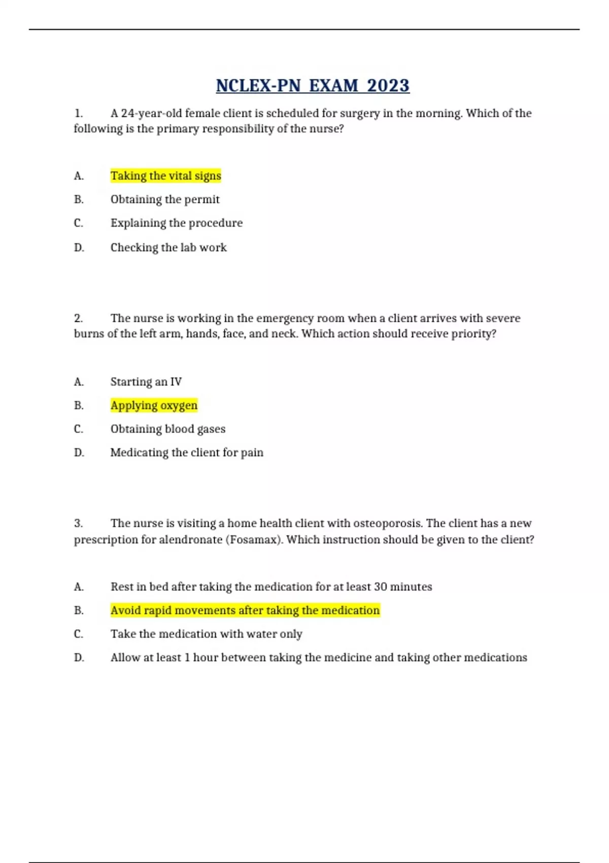 . A 24-year-old female client is scheduled for surgery in the morning. Which of the following is the primary responsibility of the nurse? A. Taking the vital signs B. Obtaining the permit C. Explaining the procedure D. Checking the lab work
