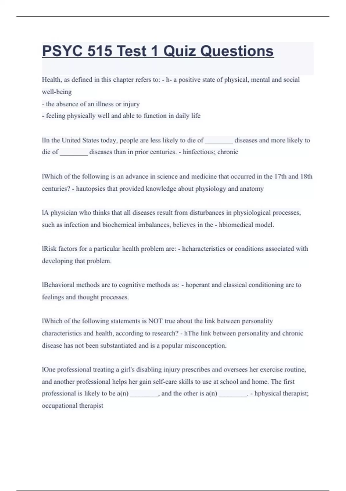 Health, as defined in this chapter refers to: - h- a positive state of physical, mental and social well-being - the absence of an illness or injury - feeling physically well and able to function in daily life lIn the United States today, people are less likely to die of ________ diseases and more likely to die of ________ diseases than in prior centuries. - hinfectious; chronic lWhich of the following is an advance in science and medicine that occurred in the 17th and 18th centuries? - hautopsies that provided knowledge about physiology and anatomy lA physician who thinks that all diseases result from disturbances in physiological processes, such as infection and biochemical imbalances, believes in the - hbiomedical model. lRisk factors for a particular health problem are: - hcharacteristics or conditions associated with developing that problem. lBehavioral methods are to cognitive methods as: - hoperant and classical conditioning are to feelings and thought processes. lWhich of the following statements is NOT true about the link between personality characteristics and health, according to research? - hThe link between personality and chronic disease has not been substantiated and is a popular misconception. lOne professional treating a girl's disabling injury prescribes and oversees her exercise routine, and another professional helps her gain self-care skills to use at school and home. The first professional is likely to be a(n) ________, and the other is a(n) ________. - hphysical therapist; occupational therapist lA useful theory - his clearly stated and makes testable predictions. lResearch using experimental methods usually - h-assigns subjects to conditions randomly. -can lead to cause-effect conclusions. -often uses placebo or double-blind procedures. lAll of the following are behavioral risk factors for leading causes of death in the U. S. today EXCEPT - hToo much physical activity lStudies that are not experiments but look like they are because they have separate groups of subjects are called ________ studies. - hquasi-experimental lWe continue to engage in unhealthy behaviors because: - h-They are reinforced by short term gratification -Some unhealthy behaviors are highly addictive -We may give in to social pressures