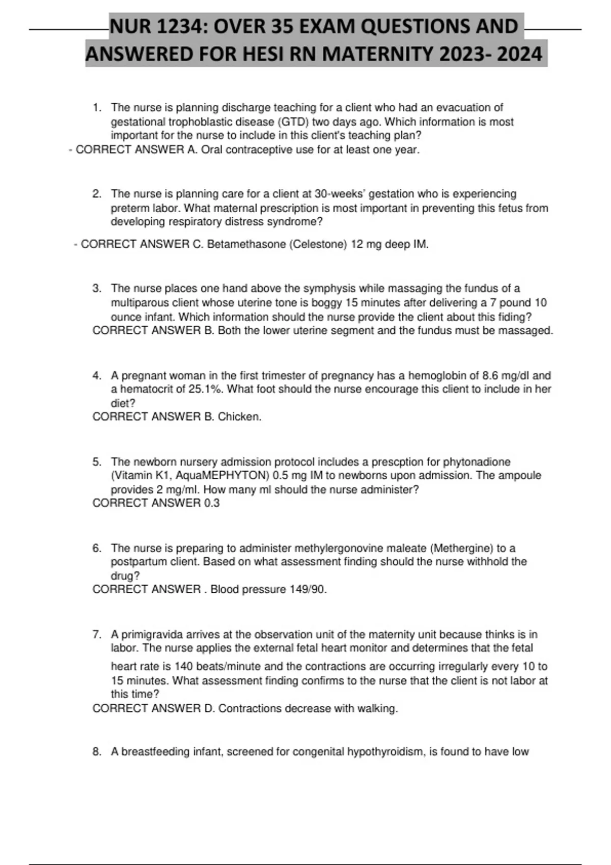 NUR 1234 OVER 35 EXAM QUESTIONS AND ANSWERED FOR HESI RN MATERNITY 2023-