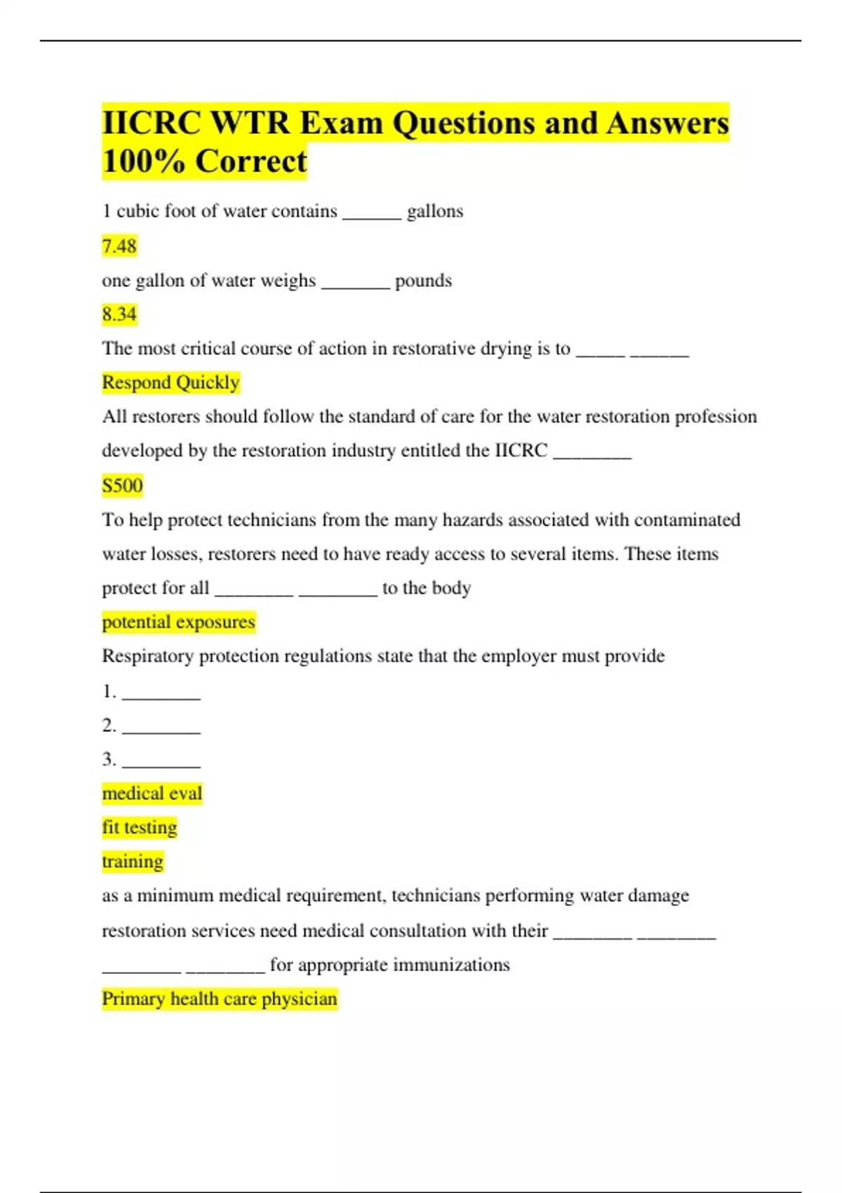 IICRC WTR Exam Questions and Answers 100% Correct IICRC WTR Exam Questions and Answers 100% Correct 1 cubic foot of water contains ______ gallons 7.48 one gallon of water weighs _______ pounds 8.34 The most critical course of action in restorative drying is to _____ ______ Respond Quickly All restorers should follow the standard of care for the water restoration profession developed by the restoration industry entitled the IICRC ________ S500 To help protect technicians from the many hazards associated with contaminated water losses, restorers need to have ready access to several items. These items protect for all ________ ________ to the body potential exposures Respiratory protection regulations state that the employer must provide 1. ________ 2. ________ 3. ________ medical eval fit testing training as a minimum medical requirement, technicians performing water damage restoration services need medical consultation with their ________ ________ ________ ________ for appropriate immunizations Primary health care physician The contract clearly states the agreement between the building owner and the restoration contractor. The form specifies who is responsible for payment and should be signed ________ work begins Before The technician's first responsibility when arriving at a water damaged sites is to identify, communicate and eliminate ________ ________ safety hazards The most common safety hazards associated with water damaged structures result in ________ and ________ slips and falls Federal regulations apply to the handling of ________ based paint and asbestos lead after safety concerns have been addressed and the initial water source has been stopped, the restorer must complete an evaluation of the water's migration through the structure. During this process, the restorer inspects all ________ ________ areas potentially affected the ultimate goal is to find the "edge" of water migration, which moves in a threedimensional path throughout the structure. This is accomplished across carpeted surfaces using a ________ ________, and across most hard surfaces using a ________ (non-penetrating) moisture meter. moisture sensor non-invasive Water from a clean source with no substantial risk of causing sickness or discomfort is said to be ________ ________ water
