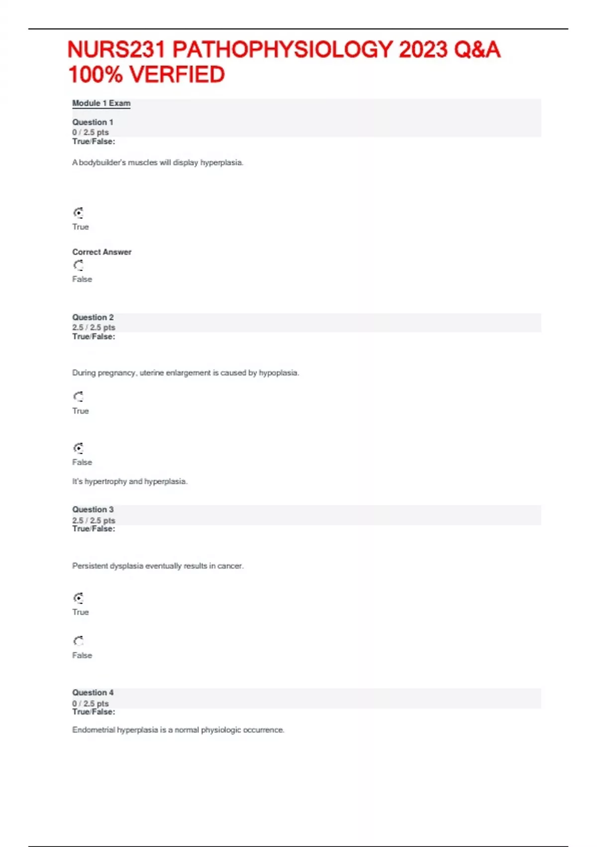 NURS231 PATHOPHYSIOLOGY 2023 Q&A 100% VERFIED Question 2 2.5 / 2.5 pts Question 3 2.5 / 2.5 pts Question 4 0 / 2.5 pts True/False: A bodybuilder’s muscles will display hyperplasia. True Correct Answer False True/False: During pregnancy, uterine enlargement is caused by hypoplasia. True False It’s hypertrophy and hyperplasia. True/False: Persistent dysplasia eventually results in cancer. True False True/False: Endometrial hyperplasia is a normal physiologic occurrence. Module 1 Exam Question 1 0 / 2.5 pts NURS231 PATHOPHYSIOLOGY 2023 Q&A 100% VERFIED Question 5 10 / 10 pts c. Sensitivity b. Reliability a. Validity d. Specificity Question 6 2.5 / 2.5 pts True Correct Answer False Match the following: 1. Proportion of people with a disease who are positive for that disease a. Validity 2. How likely the same result will occur if repeated b. Reliability 3. How a tool measures what it is intended to measure c. Sensitivity 4. People without the disease who are negative on a given test d. Specificity Proportion of people with a disease who are positive for that disease How likely the same result will occur if repeated How a tool measures what it is intended to measur