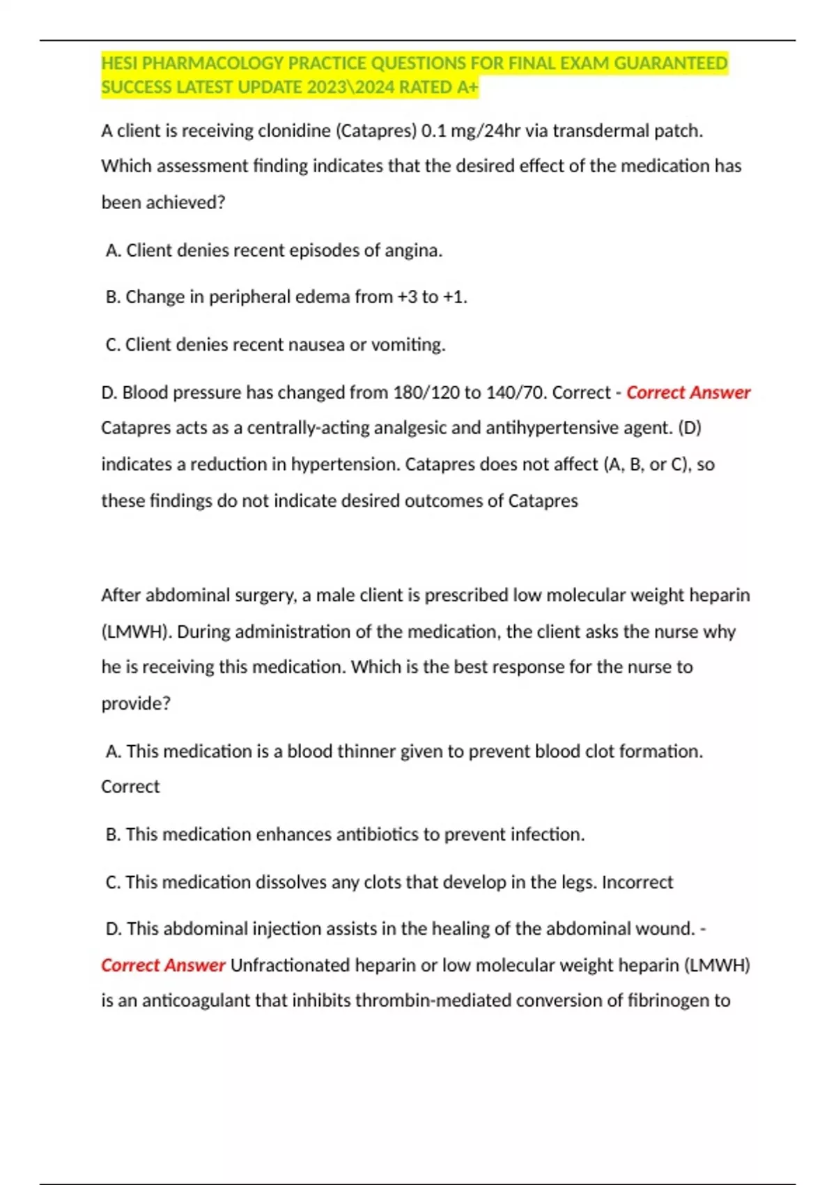 Summary HESI PHARMACOLOGY PRACTICE QUESTIONS FOR FINAL EXAM GUARANTEED SUCCESS LATEST UPDATE RATED A+