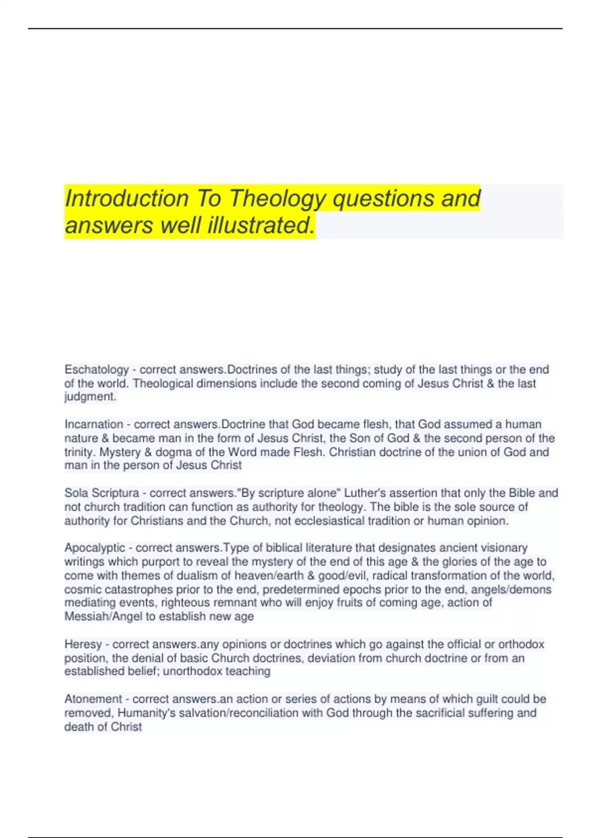 Introduction To Theology exam questions and answers well illustrated. Eschatology - correct answers.Doctrines of the last things; study of the last things or the end of the world. Theological dimensions include the second coming of Jesus Christ & the last judgment. Incarnation - correct answers.Doctrine that God became flesh, that God assumed a human nature & became man in the form of Jesus Christ, the Son of God & the second person of the trinity. Mystery & dogma of the Word made Flesh. Christian doctrine of the union of God and man in the person of Jesus Christ Sola Scriptura - correct answers."By scripture alone" Luther's assertion that only the Bible and not church tradition can function as authority for theology. The bible is the sole source of authority for Christians and the Church, not ecclesiastical tradition or human opinion. Apocalyptic - correct answers.Type of biblical literature that designates ancient visionary writings which purport to reveal the mystery of the end of this age & the glories of the age to come with themes of dualism of heaven/earth & good/evil, radical transformation of the world, cosmic catastrophes prior to the end, predetermined epochs prior to the end, angels/demons mediating events, righteous remnant who will enjoy fruits of coming age, action of Messiah/Angel to establish new age Heresy - correct opinions or doctrines which go against the official or orthodox position, the denial of basic Church doctrines, deviation from church doctrine or from an established belief; unorthodox teaching Atonement - correct action or series of actions by means of which guilt could be removed, Humanity's salvation/reconciliation with God through the sacrificial suffering and death of Christ Soteriology - correct answers.Part of theology dealing with the work of Christ & how Christ saves us. The study of the Christian doctrine of salvation - it's function & meaning. Primarily concerned with the saving work of Jesus Christ. Grace - correct free and unmerited gift of God's loving and active presence in the universe and in our lives; extended to sinful humanity in providing salvation & forgiveness through Jesus Christ & is not deserved, & withholding judgment that is deserved Tradition - correct answers.The transmission of a beliefs, doctrines, rituals, Scriptures, & the life of the Church;The process of transmission and what is transmitted throughout history of church. Apologetics - correct endeavor to provide a reasoned account of the grounds for believing in the Christian faith Concupiscence - correct answers.The desire of the self for the self, which is the human tendency toward sin; an inclination to commit sin that can be found in human desires and appetites as a result of Original Sin; inordinate desire which is the root of sin. Subordinationism - correct which holds that the nature and status of Jesus Christ is less than that of God the Father, or that the Holy Spirit is inferior to the Father and the Son. Sacrament - correct answers.An outward sign instituted by God to convey an inward or spiritual grace. They are liturgical practices of churches. Apostolicity - correct answers.Having the authority & sanction of the apostles. It is often used as a mark of the church to indicate the essential continuity of the church with apostolic teaching Deism - correct answers.A view which holds that knowledge of God comes through reason rather than revelation, & that after God created the universe, God has had no further involvement in it Epistemology - correct answers.a branch of philosophy that investigates the origin, nature, methods, grounds, and limits of human knowledge; study of how human knowledge is obtained, its bases, forms, criteria, & validity; how we know what we know. Omnipotence - correct -powerful; God's sovereignty over all things; God's ability to do all things that do not conflict with divine will or knowledge & limited only by God's nature & not external forces. Logos - correct answers.A Greek word meaning "Word". Refers to the second Person of the Trinity, Jesus Christ, who as the creative power of God embodied truth & was God incarnate. Inspiration - correct answers.That which moves humans to receive divine truths, associated particularly w/ biblical writers in the writing of Scripture Fundamentalism - correct answers.Literal interpretation and strict adherence to basic principles of a religion (or a religious branch, denomination, or sect). Original Sin - correct answers.The condition of sinfulness which all persons share, caused the fall of Adam & Eve. It consists of the loss of original righteousness & the distortion of the image of God.