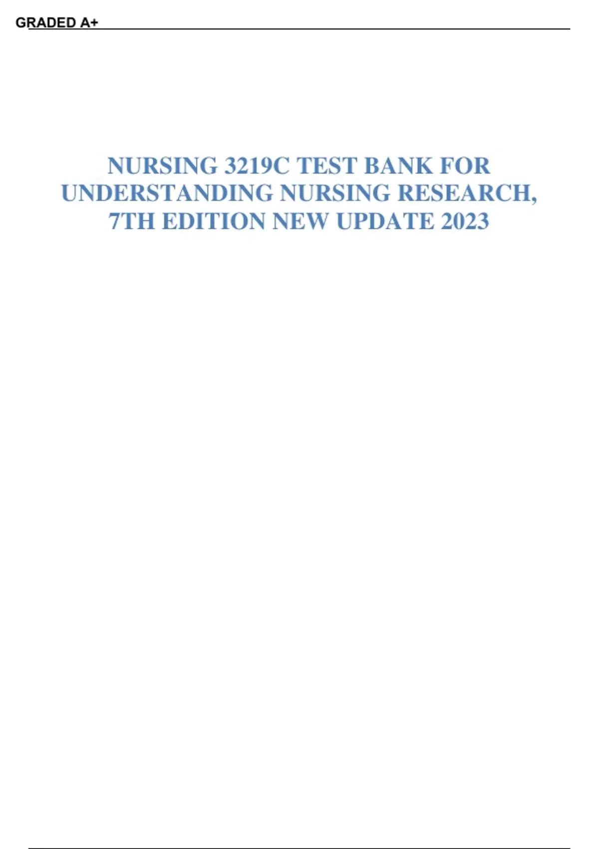 Chapter 01: Introduction to Nursing Research and Its Importance in Building an Evidence-Based Practice Grove: Understanding Nursing Research, 7th Edition MULTIPLE CHOICE 1. Which statement best describes evidence-based practice (EBP)? a. A combination of best research evidence, clinical expertise, and the needs and values of patients b. A determination of the factors necessary to control patient responses to care and delivery of care c. The development of population care guidelines applicable to all patients d. The utilization of quantitative and qualitative studies to enhance patient outcomes ANS: A Evidence-based practice evolves from the integration of the best research evidence with clinical expertise and patient needs and values. Studies that attempt to find determinants of patient outcomes are generally experimental or quasi-experimental. They may be used to guide EBP but do not completely define it. EBP is a combination of guidelines and specific patient needs and values. Quantitative and qualitative studies applied to the evaluation of patient outcomes are part of EBP but do not completely define EBP. DIF: Cognitive level: Remembering (Knowledge) 2. The nurse is collecting data about the sleep patterns of breastfed babies as part of a larger research study. Which researNch mRethIod GwillBth.eCnurMse use when collecting data for this study? a. Control b. Description c. Explanation d. Prediction ANS: B U S N T O NURSING 3219C TEST BANK FOR UNDERSTANDING NURSING RESEARCH, 7TH EDITION New Update 2023 GRADED A+ lOMoAR cPSD|6353920 NURSING 3219C TEST BANK FOR UNDERSTANDING NURSING RESEARCH, 7TH EDITION New Update 2023 Description involves identifying and understanding the nature of nursing phenomena and the relationships among these phenomena. Control can be described as the ability to write a prescription to produce the desired results. Explanation clarifies the relationships among phenomena and identifies why certain events occur. Through prediction, the probability of a specific outcome can be estimated in a given situation. DIF: Cognitive level: Understanding (Comprehension) 3. The nurse is participating in a study and is collecting data identifying the number of obese adults whose parents were also obese or overweight. Which research method is being used in this study? a. Control b. Description c. Explanation d. Prediction ANS: D Through prediction, the probability of a specific outcome can be estimated in a given situation. By knowing the percentage of parents of obese adults who were obese, the probability of predicting this may be calculated. Control indicates the ability to use a prescribed intervention to produce the desired results. Description involves identifying and understanding the nature of nursing phenomena and the relationships among these phenomena. Explanation clarifies the relationships among phenomena and identifies why certain events occur. DIF: Cognitive level: Applying (Application) 4. The nurse reviews a study in which adherence to an asthma action plan is compared among groups of young adults who received different asthma education. Which research method does this represent? a. Control b. Description c. Explanation d. Prediction ANS: C Explanation clarifies the relationships among phenomena and identifies why certain events occur. Control indicates the ability to use a prescribed intervention to produce the desired results. Description involves identifying and understanding the nature of nursing phenomena and the relationships among these phenomena. Through prediction, the probability of a specific outcome can be estimated in a given situation. DIF: Cognitive level: Applying (Application) 5. A nurse manager is interestedNiUn RleSar IniNngGwTh Bic.h CaOttiMtudes among staff nurses may indicate relative risk of needle-stick injuries. To study this, the nurse manager will employ which method of study? a. Control b. Description c. Explanation NURSING 3219C TEST BANK FOR UNDERSTANDING NURSING RESEARCH, 7TH EDDown IlToad IeOd bNy youNn saemw(samUsonpkardiukai04t@egma2il.0com2)3 GRADED A+ lOMoAR cPSD|6353920 NURSING 3219C TEST BANK FOR UNDERSTANDING NURSING RESEARCH, 7TH EDITION New Update 2023 d. Prediction ANS: D Through prediction, the probability of a specific outcome can be estimated in a given situation. Control indicates the ability to use a prescribed intervention to produce the desired results. Description involves identifying and understanding the nature of nursing phenomena and the relationships among these phenomena. Explanation clarifies the relationships among phenomena and identifies why certain events occur. DIF: Cognitive level: Applying (Application) 6. Which is the most important result of Florence Nightingale’s data collection and statistical analysis during the Crimean War? a. Bringing awareness of the rigors of war to the general public in relation to care practices b. Developing a process for statistical analysis and nursing documentation c. Identifying and defining the role of nurses in modern health care d. Using clinical research to evaluate the need for sanitation, clean drinking water, NURSING 3219C TEST BANK FOR UNDERSTANDING NURSING RESEARCH, 7TH EDDown IlToad IeOd bNy youNn saemw(samUsonpkardiukai04t@egma2il.0com2)3 GRADED A+ lOMoAR cPSD|6353920 NURSING 3219C TEST BANK FOR UNDERSTANDING NURSING RESEARCH, 7TH EDITION New Update 2023 and adequate nutrition ANS: D Nightingale’s research enabled her to instigate attitudinal, organizational, and social changes, including the military’s approach to the care of the sick and society’s sense of responsibility for testing public water, improving sanitation, and preventing starvation to decrease morbidity and mortality rates. Bringing awareness of the rigors of war to the public, developing a process for statistical analysis and nursing documentation, and identifying and defining the role of nurses in modern health care were not the most important results. DIF: Cognitive level: Understan
