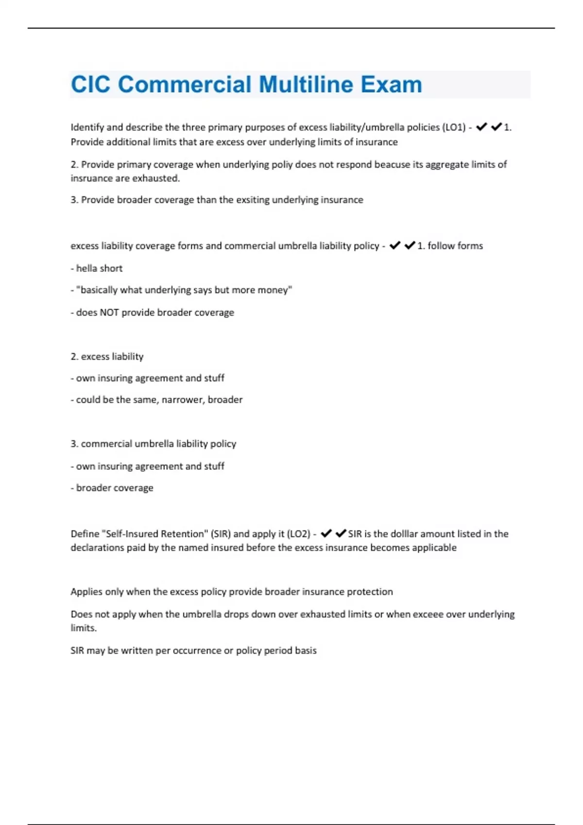 Identify and describe the three primary purposes of excess liability/umbrella policies (LO1) - 1. Provide additional limits that are excess over underlying limits of insurance 2. Provide primary coverage when underlying poliy does not respond beacuse its aggregate limits of insruance are exhausted. 3. Provide broader coverage than the exsiting underlying insurance excess liability coverage forms and commercial umbrella liability policy - 1. follow forms - hella short - "basically what underlying says but more money" - does NOT provide broader coverage 2. excess liability - own insuring agreement and stuff - could be the same, narrower, broader 3. commercial umbrella liability policy - own insuring agreement and stuff - broader coverage Define "Self-Insured Retention" (SIR) and apply it (LO2) - SIR is the dolllar amount listed in the declarations paid by the named insured before the excess insurance becomes applicable Applies only when the excess policy provide broader insurance protection Does not apply when the umbrella drops down over exhausted limits or when exceee over underlying limits. SIR may be written per occurrence or policy period basisExplain the importance of concurrent dates and be able to provide solutions for non-concurrency situations (LO3) - Concurrent dates means the policy period of the excess/umbrella policy are the same as those of the underlying insurance policies The declarations of the excess liability has a schedule of underlying insurance that indicates the required limits that are to be in effect at its effective date. The underlying limits must be unimpaired at the effective debate of the excess liability Describe the underlying insurance requirements of excess liability/commercial umbrella policies and apply the in a practical applications. (LO4)*** - Coverage Most insures typically require CGL, Business Auto and Employer Liability Other liability policies may be required for other known exposure such as aircraft, Iiquor liability, watercraft Limits of Insruance limits required by varies by insurer Some exposures require higher underlying limits The required limits must be in full effect at the effective date of the policy period Compare and contract the insuring agreement known as pay on behalf and indemnify (LO5) - Pay on Behalf of - The insure has stricter control of defense, investigation or settlements - The insurer pays damages directly to third party on behalf of -The insure has the duty to defend when the underlying does not provide coverage Indemnify - strict indemnity (insured uses their own funds directly to pay claims and insurer reimburses) - based on legal obligations to pay (insured still has control but indemnity is based on legal obligation to pay - insurer write checks to insured) types of damages, defense costs, and ultimate net loss in Excess liability and umbrella policieswhat is the coverage area - damages - follow form follows underlying - excess liability/commercial umbrella (pay because of bodily injury and property damage as defined or pays because of personal advertising injury as defined) defense - duty to defend - not duty to defend in some cases (still right to defend) - defense cost included within the SIR is often referred to as first dollar defense ultimate net loss (different ways to pay this- what the court says must be paid) - all sums paid or payable in settlement - all sums paid or payable as damages coverage area - worldwide or anywhere in universe, could also be limited exclusions for excess and umbrella - - aircraft - watercraft - contractual liability - liquor liability - pollution - damage to property - damage to your work - imparted property - electronic data liability - professional - uninsured and underinsured motorists- Employment related practices