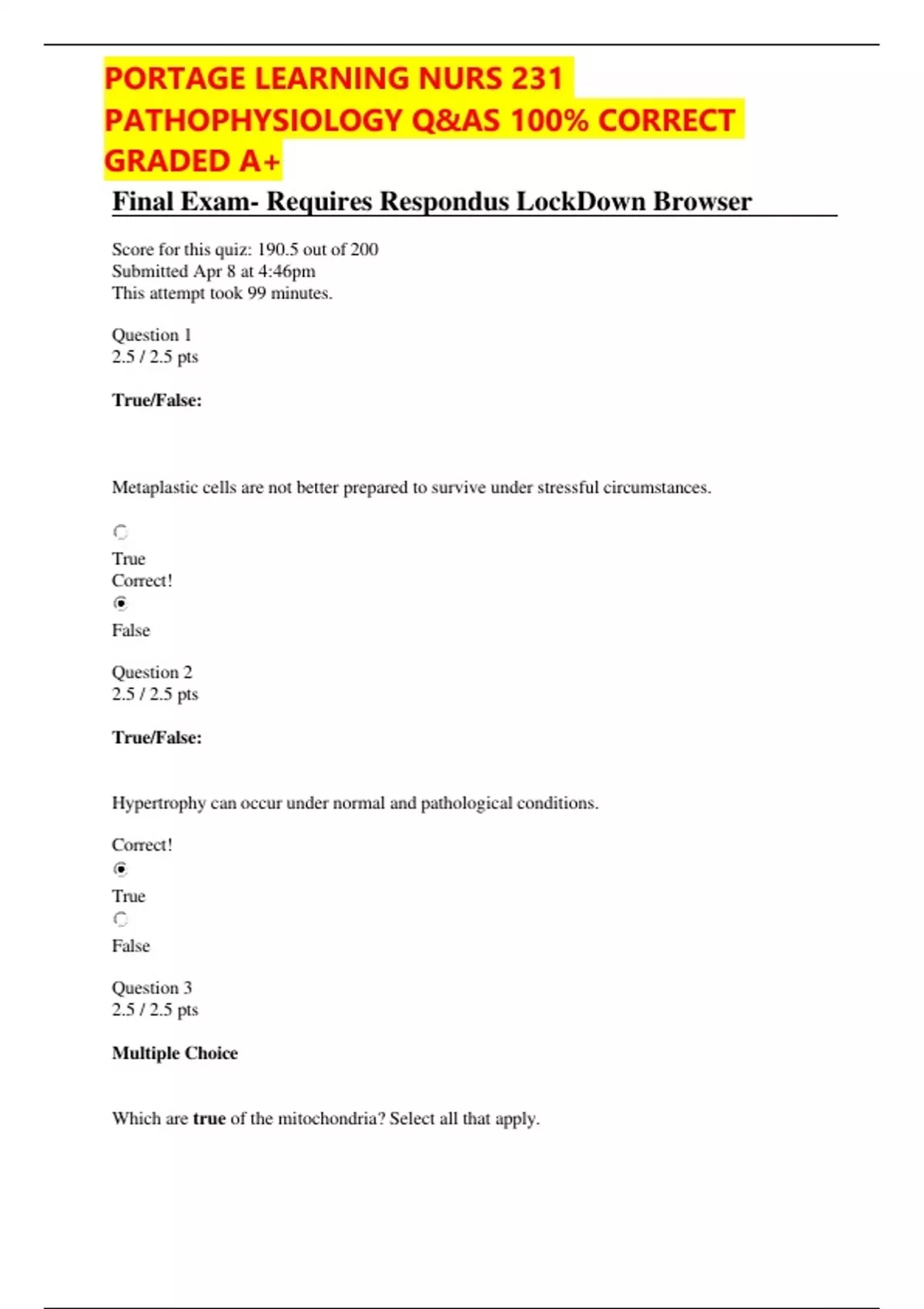 PORTAGE LEARNING NURS 231 PATHOPHYSIOLOGY Q&AS 100% CORRECT GRADED A+