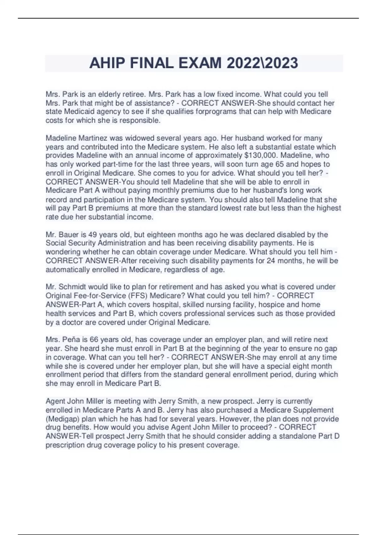 AHIP FINAL EXAM Mrs. Park is an elderly retiree. Mrs. Park has a low fixed income. What could you tell Mrs. Park that might be of assistance? - CORRECT ANSWER-She should contact her state Medicaid agency to see if she qualifies forprograms that can help with Medicare costs for which she is responsible. Madeline Martinez was widowed several years ago. Her husband worked for many years and contributed into the Medicare system. He also left a substantial estate which provides Madeline with an annual income of approximately $130,000. Madeline, who has only worked part-time for the last three years, will soon turn age 65 and hopes to enroll in Original Medicare. She comes to you for advice. What should you tell her? - CORRECT ANSWER-You should tell Madeline that she will be able to enroll in Medicare Part A without paying monthly premiums due to her husband's long work record and participation in the Medicare system. You should also tell Madeline that she will pay Part B premiums at more than the standard lowest rate but less than the highest rate due her substantial income. Mr. Bauer is 49 years old, but eighteen months ago he was declared disabled by the Social Security Administration and has been receiving disability payments. He is wondering whether he can obtain coverage under Medicare. What should you tell him - CORRECT ANSWER-After receiving such disability payments for 24 months, he will be automatically enrolled in Medicare, regardless of age. Mr. Schmidt would like to plan for retirement and has asked you what is covered under Original Fee-for-Service (FFS) Medicare? What could you tell him? - CORRECT ANSWER-Part A, which covers hospital, skilled nursing facility, hospice and home health services and Part B, which covers professional services such as those provided by a doctor are covered under Original Medicare. Mrs. Peňa is 66 years old, has coverage under an employer plan, and will retire next year. She heard she must enroll in Part B at the beginning of the year to ensure no gap in coverage. What can you tell her? - CORRECT ANSWER-She may enroll at any time while she is covered under her employer plan, but she will have a special eight month enrollment period that differs from the standard general enrollment period, during which she may enroll in Medicare Part B. Agent John Miller is meeting with Jerry Smith, a new prospect. Jerry is currently enrolled in Medicare Parts A and B. Jerry has also purchased a Medicare Supplement (Medigap) plan which he has had for several years. However, the plan does not provide drug benefits. How would you advise Agent John Miller to proceed? - CORRECT ANSWER-Tell prospect Jerry Smith that he should consider adding a standalone Part D prescription drug coverage policy to his present coverage. Mr. Diaz continued working with his company and was insured under his employer's group plan until he reached age 68. He has heard that there is a premium penalty for those who did not sign up for Part B when first eligible and wants to know how much he will have to pay. What should you tell him? - CORRECT ANSWER-The penalty will be a permanent 10% increase in his Part B premium for every 12-month period that passed during which he could have enrolled and did not. Ms. Moore plans to retire when she turns 65 in a few months. She is in excellent health and will have considerable income when she retires. She is concerned that her income will make it impossible for her to qualify for Medicare. What could you tell her to address her concern? - CORRECT ANSWER-Medicare is a program for people age 65 or older and those under age 65 with certain disabilities, end-stage renal disease, and Lou Gehrig's disease so she will be eligible for Medicare. Mildred Savage enrolled in Allcare Medicare Advantage plan several years ago. Mildred recently learned that she is suffering from inoperable cancer and has just a few months to live. She would like to spend these final months in hospice care. Mildred's family asks you whether hospice benefits will be paid for under the Allcare Medicare Advantage plan. What should you say? - CORRECT ANSWER-Mildred may remain enrolled in Allcare and make a hospice election. Hospice benefits will be paid for by Original Medicare under Part A and Allcare will continue to pay for any non-hospice services. Mr. Gomez notes that a Private Fee-for-Service (PFFS) plan available in his area has an attractive premium. He wants to know if he must use doctors in a network as his current HMO plan requires him to do. What should you tell him? - CORRECT ANSWER-He may receive health care services from any doctor allowed to bill Medicare, as long as he shows the doctor the plan's identification card and the doctor agrees to accept the PFFS plan's payment terms and conditions, which could include balance billing. Mr. Kelly wants to know whether he is eligible to sign up for a Private fee-for-service (PFFS) plan. What questions would you need to ask to determine his eligibility? - CORRECT ANSWER-You would need to ask Mr. Kelly if he is enrolled in Part A and Part B and if he lives in the PFFS plan's service area. Mrs. Wang wants to know generally how the benefits under Original Medicare might compare to the benefits package of a Medicare Advantage Plan before she starts looking at specific plans. What could you tell her? - CORRECT ANSWER-Medicare Advantage Plans may offer extra benefits that Original Medicare does not offer such as vision, hearing, and dental services. It must include a maximum out-of-pocket limit on Part A and Part B services. Mr. Castillo, a naturalized citizen, previously enrolled in Medicare Part B but has recently stopped paying his Part B premium. Mr. Castillo is still covered by Part A. He would like to enroll in a Medicare Advantage (MA) plan and is still covered by Part A. What should you tell him? - CORRECT ANSWER-He is not eligible to enroll in a Medicare Advantage plan until he re-enrolls in Medicare Part B. Mr. Barker enjoys a comfort
