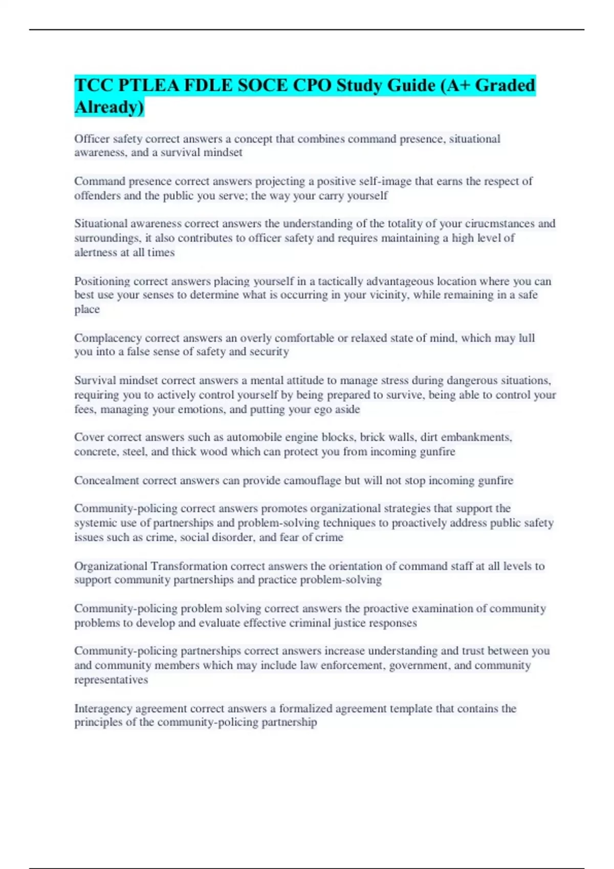 TCC PTLEA FDLE SOCE CPO Study Guide (A+ Graded Already) Officer safety correct answers a concept that combines command presence, situational awareness, and a survival mindset Command presence correct answers projecting a positive self-image that earns the respect of offenders and the public you serve; the way your carry yourself Situational awareness correct answers the understanding of the totality of your cirucmstances and surroundings, it also contributes to officer safety and requires maintaining a high level of alertness at all times Positioning correct answers placing yourself in a tactically advantageous location where you can best use your senses to determine what is occurring in your vicinity, while remaining in a safe place Complacency correct answers an overly comfortable or relaxed state of mind, which may lull you into a false sense of safety and security Survival mindset correct answers a mental attitude to manage stress during dangerous situations, requiring you to actively control yourself by being prepared to survive, being able to control your fees, managing your emotions, and putting your ego aside Cover correct answers such as automobile engine blocks, brick walls, dirt embankments, concrete, steel, and thick wood which can protect you from incoming gunfire Concealment correct answers can provide camouflage but will not stop incoming gunfire Community-policing correct answers promotes organizational strategies that support the systemic use of partnerships and problem-solving techniques to proactively address public safety issues such as crime, social disorder, and fear of crime Organizational Transformation correct answers the orientation of command staff at all levels to support community partnerships and practice problem-solving Community-policing problem solving correct answers the proactive examination of community problems to develop and evaluate effective criminal justice responses Community-policing partnerships correct answers increase understanding and trust between you and community members which may include law enforcement, government, and community representatives Interagency agreement correct answers a formalized agreement template that contains the principles of the community-policing partnership