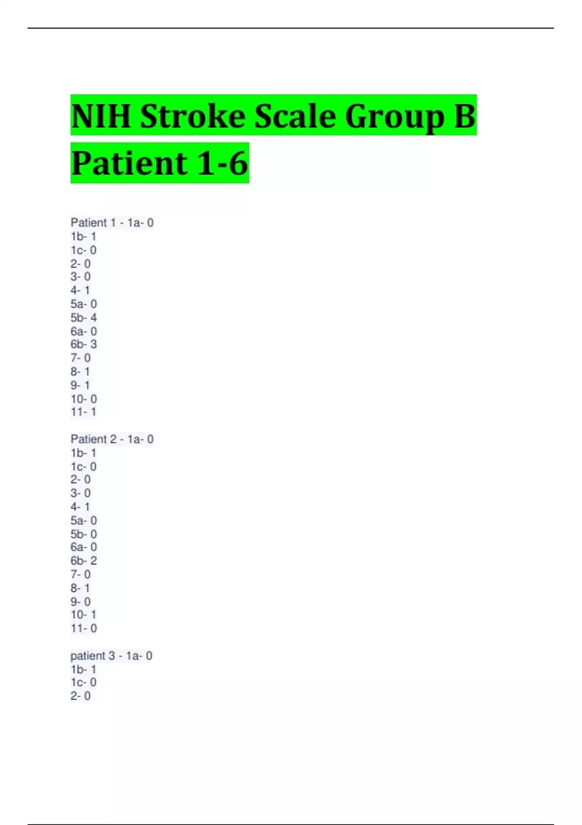NIH Stroke Scale Group B Patient 1-6 Patient 1 - 1a- 0 1b- 1 1c- 0 2- 0 3- 0 4- 1 5a- 0 5b- 4 6a- 0 6b- 3 7- 0 8- 1 9- 1 10- 0 11- 1 Patient 2 - 1a- 0 1b- 1 1c- 0 2- 0 3- 0 4- 1 5a- 0 5b- 0 6a- 0 6b- 2 7- 0 8- 1 9- 0 10- 1 11- 0 patient 3 - 1a- 0 1b- 1 1c- 0 2- 0 3- 0 4- 3 5a- 0 5b- 0 6a- 0 6b- 0 7- 0 8- 0 9- 0 10- 1 11- 0 Patient 4 - 1a- 3 1b- 2 1c- 2 2- 2 3- 2 4- 2 5a- 0 5b- 4 6a- 2 6b- 4 7- 0 8- 1 9- 3 10- 2 11- 2 Patient 5 - 1a- 0 1b- 0 1c- 0 2- 0 3- 0 4- 0 5a- 0 5b- 0 6a- 1 6b- 0 7- 1 8- 1 9- 0 10- 0 11- 1 Patient 6 - 1a- 0 1b- 0 1c- 0 2- 0 3- 0 4- 0 5a- 0 5b- 0 6a- 0 6b- 1 7- 0 8- 1 9- 0 10- 0 11- 0