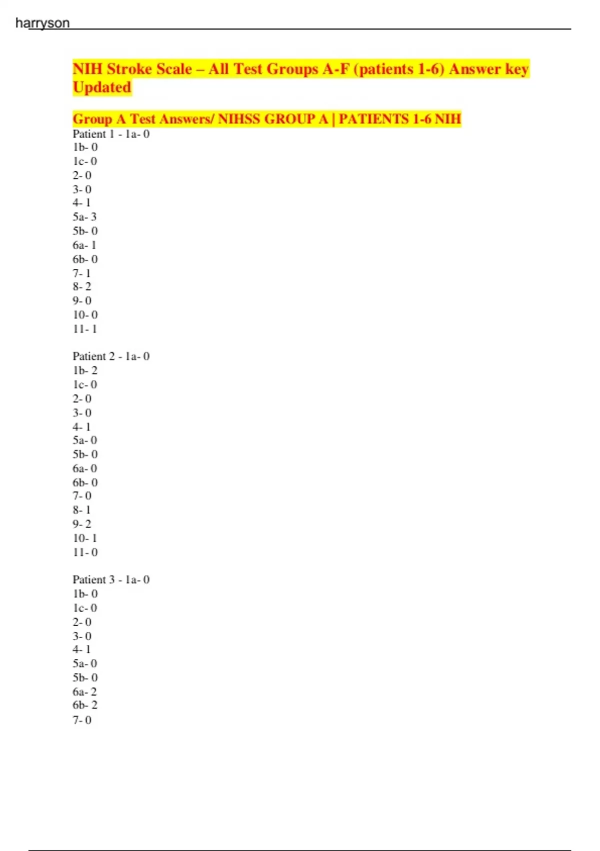Nih stroke scale all test groups a f patients 1 6 answer key updatedNIH Stroke Scale – All Test Groups A-F (patients 1-6) Answer key Updated Group A Test Answers/ NIHSS GROUP A | PATIENTS 1-6 NIH Patient 1 - 1a- 0 1b- 0 1c- 0 2- 0 3- 0 4- 1 5a- 3 5b- 0 6a- 1 6b- 0 7- 1 8- 2 9- 0 10- 0 11- 1 Patient 2 - 1a- 0 1b- 2 1c- 0 2- 0 3- 0 4- 1 5a- 0 5b- 0 6a- 0 6b- 0 7- 0 8- 1 9- 2 10- 1 11- 0 Patient 3 - 1a- 0 1b- 0 1c- 0 2- 0 3- 0 4- 1 5a- 0 5b- 0 6a- 2 6b- 2 7- 0 harryson 8- 1 9- 0 10- 1 11- 0 Patient 4 - 1a- 0 1b- 0 1c- 0 2- 0 3- 0 4- 1 5a- 0 5b- 0 6a- 0 6b- 0 7- 0 8- 1 9- 0 10- 0 11- 0 Patient 5 - 1a- 0 1b- 1 1c- 0 2- 0 3- 2 4- 2 5a- 4 5b- 0 6a- 1 6b- 0 7- 1 8- 1 9- 1 10- 0 11- 1 Patient 6 - 1a- 0 1b- 0 1c- 0 2- 0 3- 0 4- 0 5a- 0 5b- 0 6a- 0 6b- 1 harryson 7- 0 8- 1 9- 0 10- 0 11- 0 NIH Stroke Scale Group B Patient 1-6 Patient 1 - 1a- 0 1b- 1 1c- 0 2- 0 3- 0 4- 1 5a- 0 5b- 4 6a- 0 6b- 3 7- 0 8- 1 9- 1 10- 0 11- 1 Patient 2 - 1a- 0 1b- 1 1c- 0 2- 0 3- 0 4- 1 5a- 0 5b- 0 6a- 0 6b- 2 7- 0 8- 1 9- 0 10- 1 11- 0 patient 3 - 1a- 0 1b- 1 1c- 0 2- 0 3- 0 4- 3 5a- 0