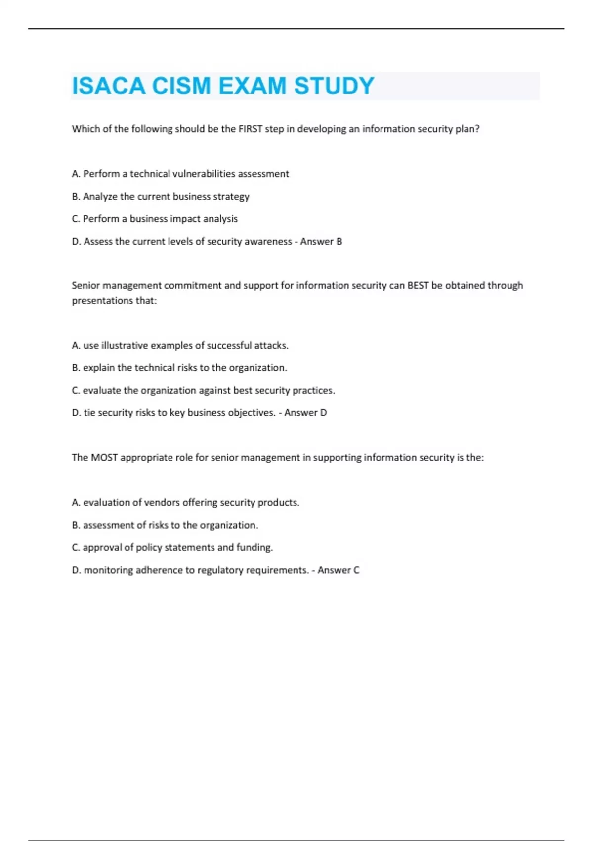 Which of the following should be the FIRST step in developing an information security plan? A. Perform a technical vulnerabilities assessment B. Analyze the current business strategy C. Perform a business impact analysis D. Assess the current levels of security awareness - Answer B Senior management commitment and support for information security can BEST be obtained through presentations that: A. use illustrative examples of successful attacks. B. explain the technical risks to the organization. C. evaluate the organization against best security practices. D. tie security risks to key business objectives. - Answer D The MOST appropriate role for senior management in supporting information security is the: A. evaluation of vendors offering security products. B. assessment of risks to the organization. C. approval of policy statements and funding. D. monitoring adherence to regulatory requirements. - Answer C