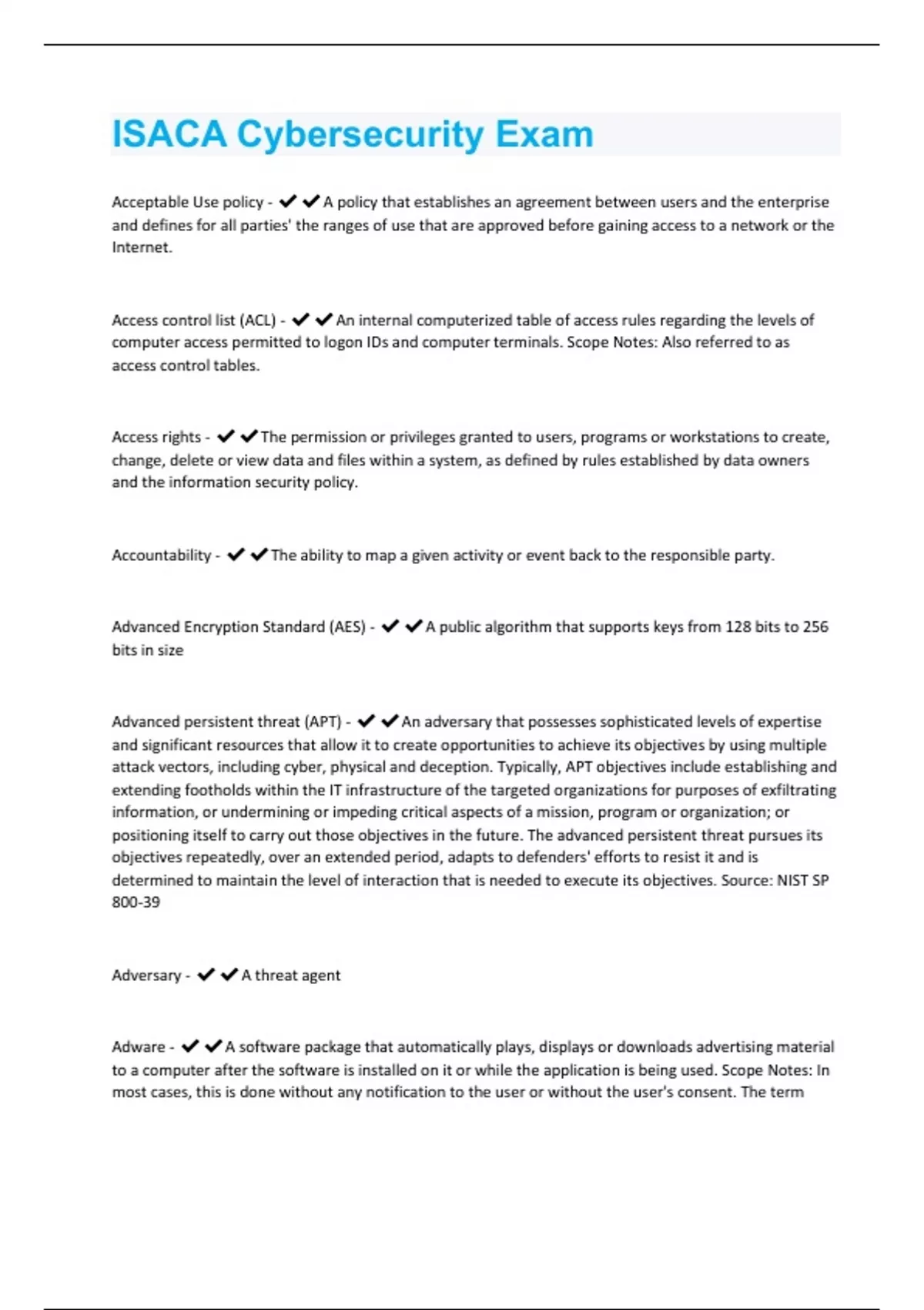 Acceptable Use policy - A policy that establishes an agreement between users and the enterprise and defines for all parties' the ranges of use that are approved before gaining access to a network or the Internet. Access control list (ACL) - An internal computerized table of access rules regarding the levels of computer access permitted to logon IDs and computer terminals. Scope Notes: Also referred to as access control tables. Access rights - The permission or privileges granted to users, programs or workstations to create, change, delete or view data and files within a system, as defined by rules established by data owners and the information security policy. Accountability - The ability to map a given activity or event back to the responsible party. Advanced Encryption Standard (AES) - A public algorithm that supports keys from 128 bits to 256 bits in size Advanced persistent threat (APT) - An adversary that possesses sophisticated levels of expertise and significant resources that allow it to create opportunities to achieve its objectives by using multiple attack vectors, including cyber, physical and deception. Typically, APT objectives include establishing and extending footholds within the IT infrastructure of the targeted organizations for purposes of exfiltrating information, or undermining or impeding critical aspects of a mission, program or organization; or positioning itself to carry out those objectives in the future. The advanced persistent threat pursues its objectives repeatedly, over an extended period, adapts to defenders' efforts to resist it and is determined to maintain the level of interaction that is needed to execute its objectives. Source: NIST SP 800-39 Adversary - A threat agent Adware - A software package that automatically plays, displays or downloads advertising material to a computer after the software is installed on it or while the application is being used. Scope Notes: In most cases, this is done without any notification to the user or without the user's consent. The termadware may also refer to software that displays advertisements, whether or not it does so with the user's consent; such programs display advertisements as an alternative to shareware registration fees. These are classified as adware in the sense of advertising supported software, but not as spyware. Adware in this form does not operate surreptitiously or mislead the user, and it provides the user with a specific service. Analog - A transmission signal that varies continuously in amplitude and time and is generated in wave formation. Scope Notes: Analog signals are used in telecommunications Antimalware - A widely used technology to prevent, detect and remove many categories of malware, including computer viruses, worms, Trojans, keyloggers, malicious browser plug-ins, adware and spyware