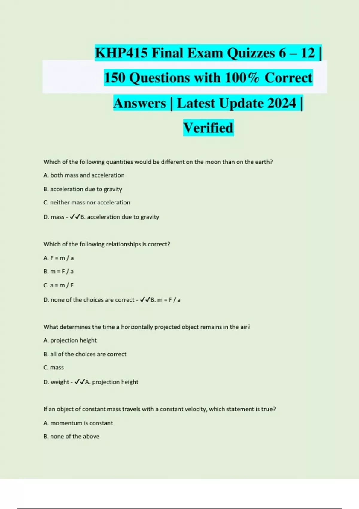 KHP415 Final Exam Quizzes 6 – 12 | 150 Questions with 100% Correct Answers | Latest Update 2024 | Verified Which of the following quantities would be different on the moon than on the earth? A. both mass and acceleration B. acceleration due to gravity C. neither mass nor acceleration D. mass - B. acceleration due to gravity Which of the following relationships is correct? A. F = m / a B. m = F / a C. a = m / F D. none of the choices are correct - B. m = F / a What determines the time a horizontally projected object remains in the air? A. projection height B. all of the choices are correct C. mass D. weight - A. projection height If an object of constant mass travels with a constant velocity, which statement is true? A. momentum is constant B. none of the above