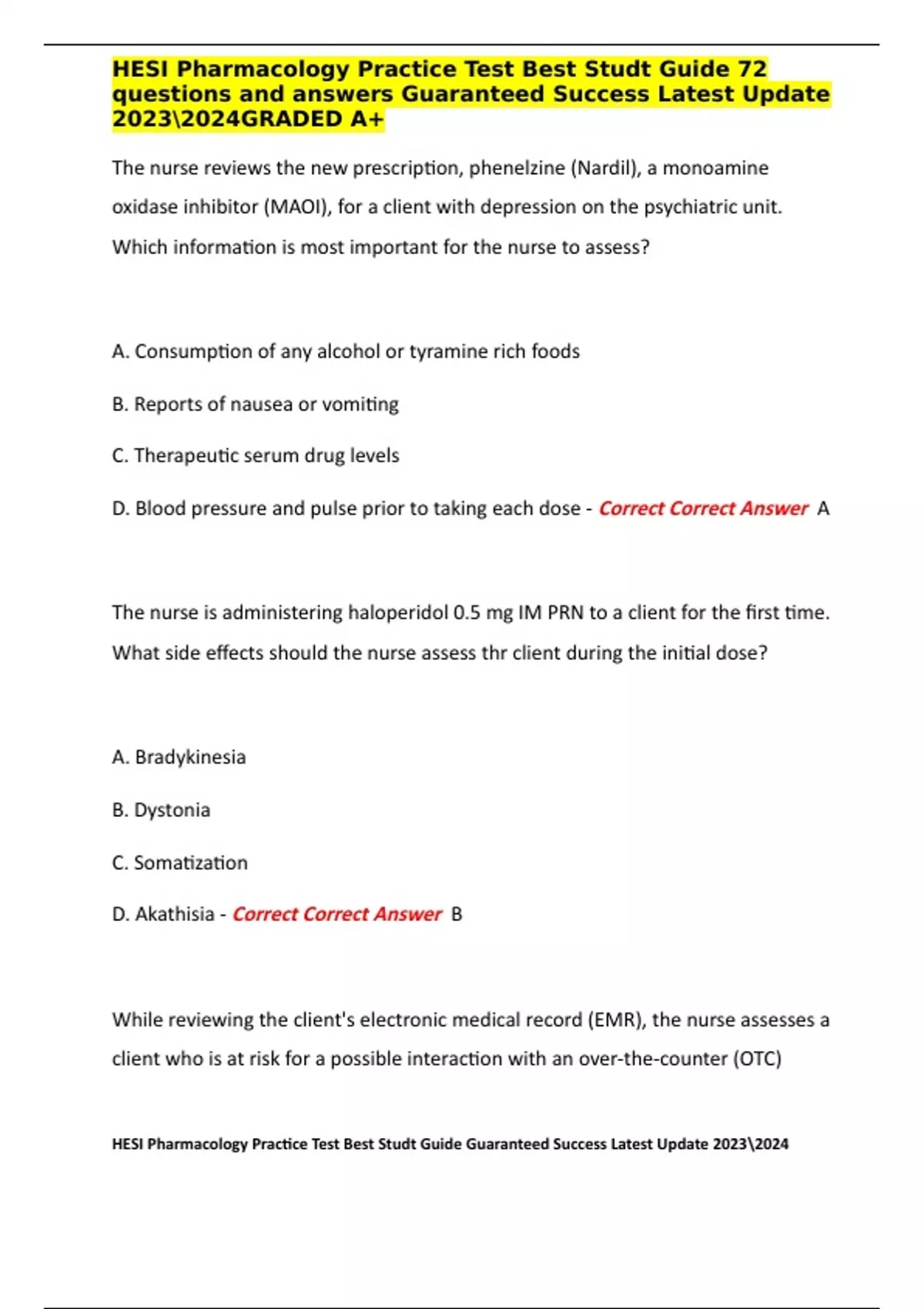 HESI Pharmacology Practice Test Best Studt Guide 72 questions and answers Guaranteed Success Latest Update GRADED A+
