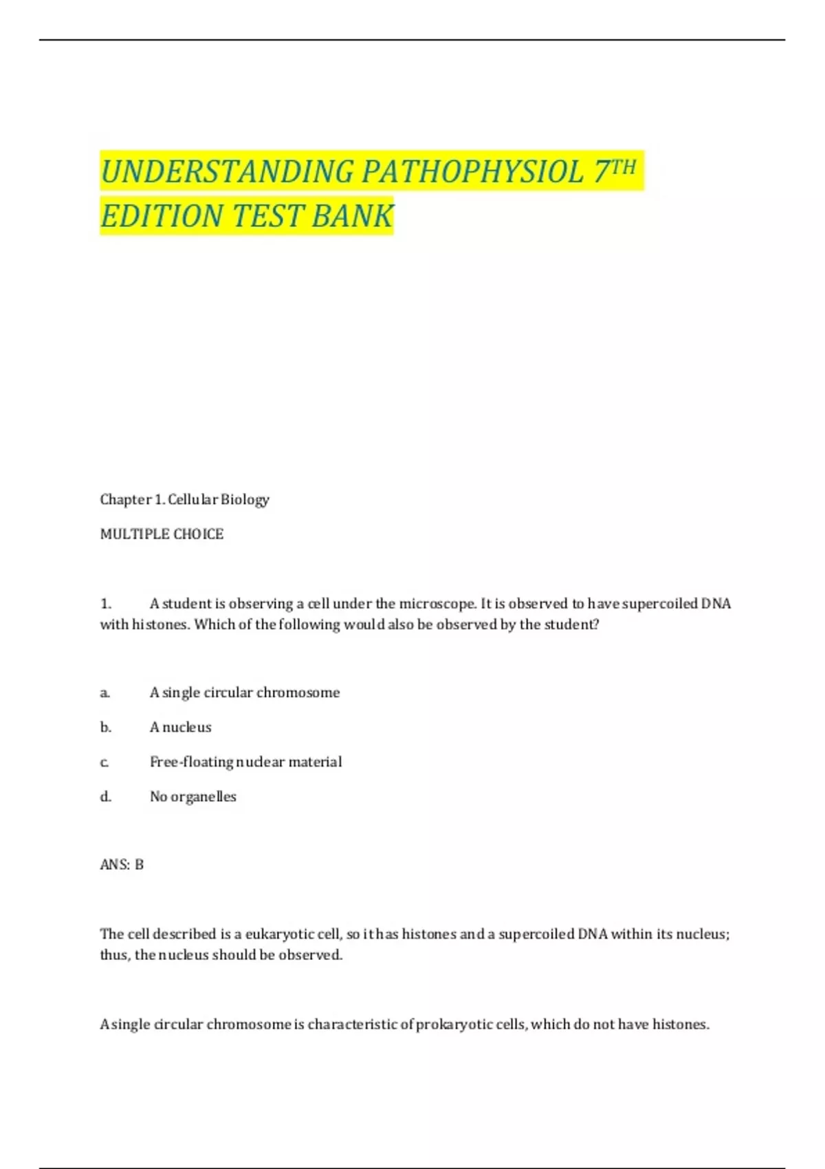 UNDERSTANDING PATHOPHYSIOL 7TH EDITION TEST BANK Chapter 1. Cellular Biology MULTIPLE CHOICE 1. A student is observing a cell under the microscope. It is observed to have supercoiled DNA with histones. Which of the following would also be observed by the student? a. A single circular chromosome b. A nucleus c. Free-floating nuclear material d. No organelles ANS: B The cell described is a eukaryotic cell, so it has histones and a supercoiled DNA within its nucleus; thus, the nucleus should be observed. A single circular chromosome is characteristic of prokaryotic cells, which do not have histones. Free-floating nuclear material describes a prokaryotic cell, which would not have a distinct nucleus. Eukaryotic cells have membrane bounded cellular components called organelles. No organelles describes a prokaryotic cell. 2. A nurse is instructing the staff about cellular functions. Which cellular function is the nurse describing when an isolated cell absorbs oxygen and uses it to transform nutrients to energy? a. Metabolic absorption b. Communication c. Secretion d. Respiration ANS: D The ability of the cell to absorb oxygen refers to the cells function of respiration. The ability of the cell to function within a society of cells refers to its function of communication. The ability of the cell to take in nutrients refers to the cells function of metabolic absorption. The ability of the cell to synthesize new substances and secrete these elsewhere refers to the cells function of secretion. 3. A eukaryotic cell is undergoing DNA replication. In which region of the cell would most of the genetic information be contained? a. Mitochondria b. Ribosome c. Nucleolus d. Nucleus ANS: C The region of the cell that contains genetic material, including a large amount of ribonucleic acid, most of the DNA, and DNA-binding proteins, is the nucleolus. The mitochondria is the site of cellular respiration. The ribosomes are involved in manufacturing of proteins within the cell. The nucleus contains the nucleolus, and it is the nucleolus that contains genetic material. 4. The fluid mosaic model for biologic membranes describes membrane behavior. According to this model, which of the following float singly or as aggregates in the fluid lipid bilayer? a. Peripheral membrane proteins b. Integral membrane proteins c. Glycoproteins d. Cell adhesion molecules ANS: B Integral membrane proteins float freely in the fluid lipid bilayer. Peripheral membrane proteins are not embedded in the layer, but reside at the surface. Glycoproteins act as cell surface markers. Cell adhesion molecules are on the outside of the membrane and allow cells to hook together. 5. Which of the following can bind to plasma membrane receptors? a. Oxygen b. Ribosomes c. Amphipathic lipids d. Ligands ANS: D Ligands are specific molecules that can bind with receptors on the cell membrane. Oxygen moves by diffusion; it does not bind to receptors. Ribosomes make proteins and are not involved in binding. Amphipathic lipids are a portion of the cell membrane. 6. A nurse is reviewing a report from a patient with metastatic cancer. What finding would support the diagnosis of metastatic cancer? Alterations in extracellular matrix that include: a. Decreased fibronectin b. Increased collagen c. Decreased elastin d. Increased glycoproteins ANS: A Reduced amounts of fibronectin are found in some types of cancerous cells, allowing cancer cells to travel, or metastasize. Collagen provides strength, and its breakdown is associated with osteoarthritis, not cancer. Elastin is found in the lungs and allows tissues to stretch; it is not associated with cancerous cells. Decreased, not increased, glycoproteins are associated with cancerous cells. 7. Which form of cell communication is used to relate to other cells in direct physical contact? a. Cell junction b. Gap junction c. Desmosomes d. Tight junctions ANS: A Cell junctions hold cells together and permit molecules to pass from cell to cell. Gap junctions allow communication from the inside of one cell to the inside of another. Desmosomes are not involved in communication, but allow cells to hold together. Tight junctions are barriers that prevent movement of some substances and leakages of others. 8. Pancreatic beta cells secrete insulin, which inhibits secretion of glucagon from neighboring alpha cells. This action is an example of which of the following signaling types? a. Paracrine b. Autocrine c. Neurohormonal d. Hormonal