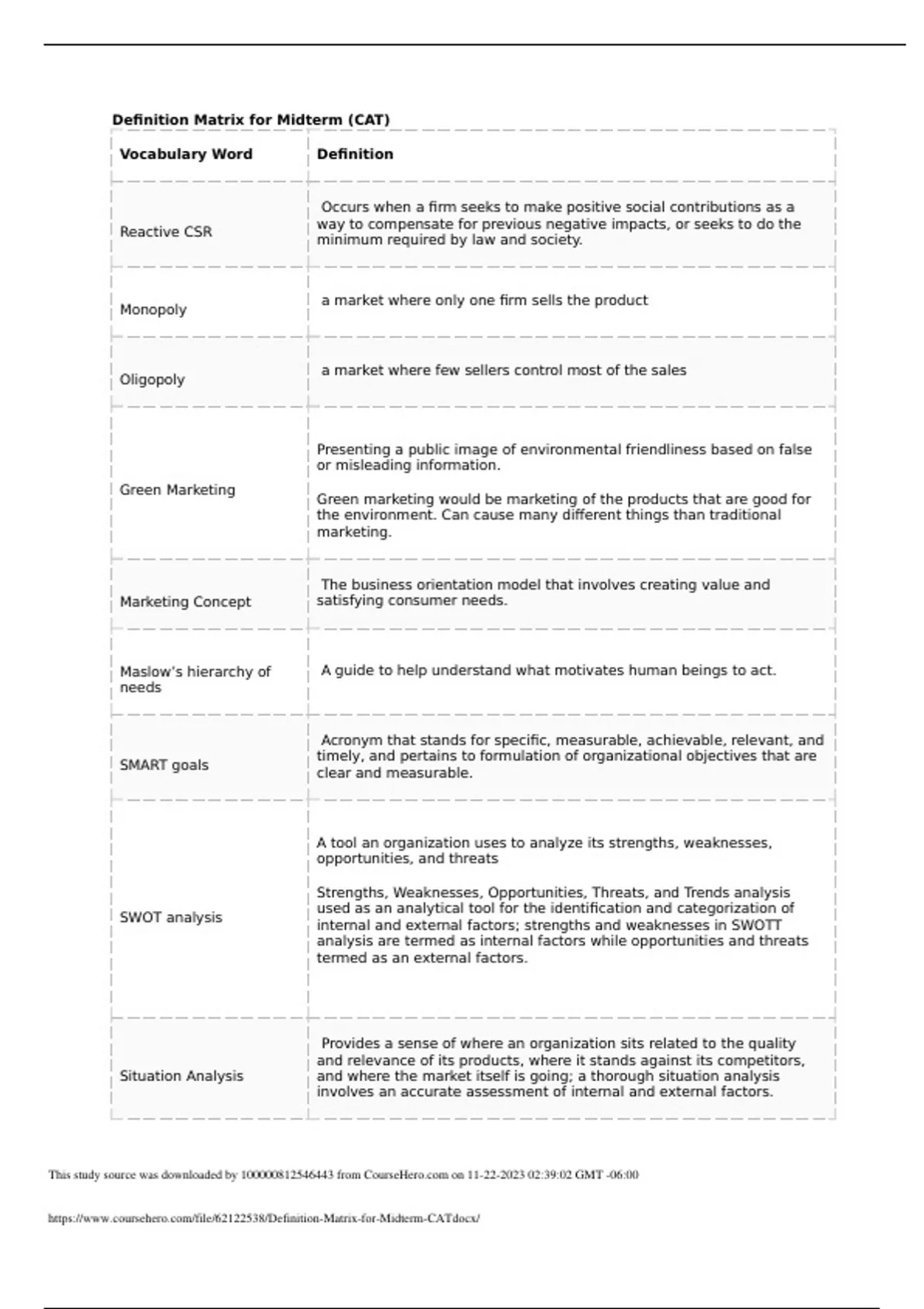 Definition Matrix for Midterm (CAT) Vocabulary Word Definition Reactive CSR Occurs when a firm seeks to make positive social contributions as a way to compensate for previous negative impacts, or seeks to do the minimum required by law and society. Monopoly a market where only one firm sells the product Oligopoly a market where few sellers control most of the sales Green Marketing Presenting a public image of environmental friendliness based on false or misleading information. Green marketing would be marketing of the products that are good for the environment. Can cause many different things than traditional marketing. Marketing Concept The business orientation model that involves creating value and satisfying consumer needs. Maslow’s hierarchy of needs A guide to help understand what motivates human beings to act. SMART goals Acronym that stands for specific, measurable, achievable, relevant, and timely, and pertains to formulation of organizational objectives that are clear and measurable. SWOT analysis A tool an organization uses to analyze its strengths, weaknesses, opportunities, and threats Strengths, Weaknesses, Opportunities, Threats, and Trends analysis used as an analytical tool for the identification and categorization of internal and external factors; strengths and weaknesses in SWOTT analysis are termed as internal factors while opportunities and threats termed as an external factors. Situation Analysis Provides a sense of where an organization sits related to the quality and relevance of its products, where it stands against its competitors, and where the market itself is going; a thorough situation analysis involves an accurate assessment of internal and external factors. This study source was downloaded by from CourseH on :39:02 GMT -06:00 Protectionism Creates barriers to entry or restrictions for foreign firms doing business in local markets in an effort to protect domestic firms from the competition. Brockway, (2018) states that protectionism "Creates barriers to entry or restrictions for foreign firms doing business in local markets in an effort to protect domestic firms from the competition." Tariff A form of protectionism in which taxes on imports protect the local market. Product Life Cycle (know the stages) Consists of four stages: introduction, growth, maturity, and decline. Introduction Stage: When a product is new to the market. Growth Stage: During the product lifecycle, when product awareness continues to build and consumers develop an understanding of the value of the product. Maturity Stage: When a product is familiar to most consumers in the target market. Decline Stage: Stage in the product life cycle when a product dissolves as a result of decreased or negative growth. B2B marketers Businesses marketing to other businesses, commonly manufacturers to wholesalers, and wholesalers marketing to retailers. B2C marketers business markets their products or services directly to consumers. This type of marketing is most familiar to consumers. B2C companies generally fall into two key categories, products or services, and there are some differences in how these environments are marketed. Early Adopters Innovators Laggards Conscious Capitalism Businesses that serve the interests of all major stakeholders— customers, employees, investors, communities, suppliers, and the environment. This study source was downloaded by from CourseH on :39:02 GMT -06:00 Is a new narrative to a good business, finding
