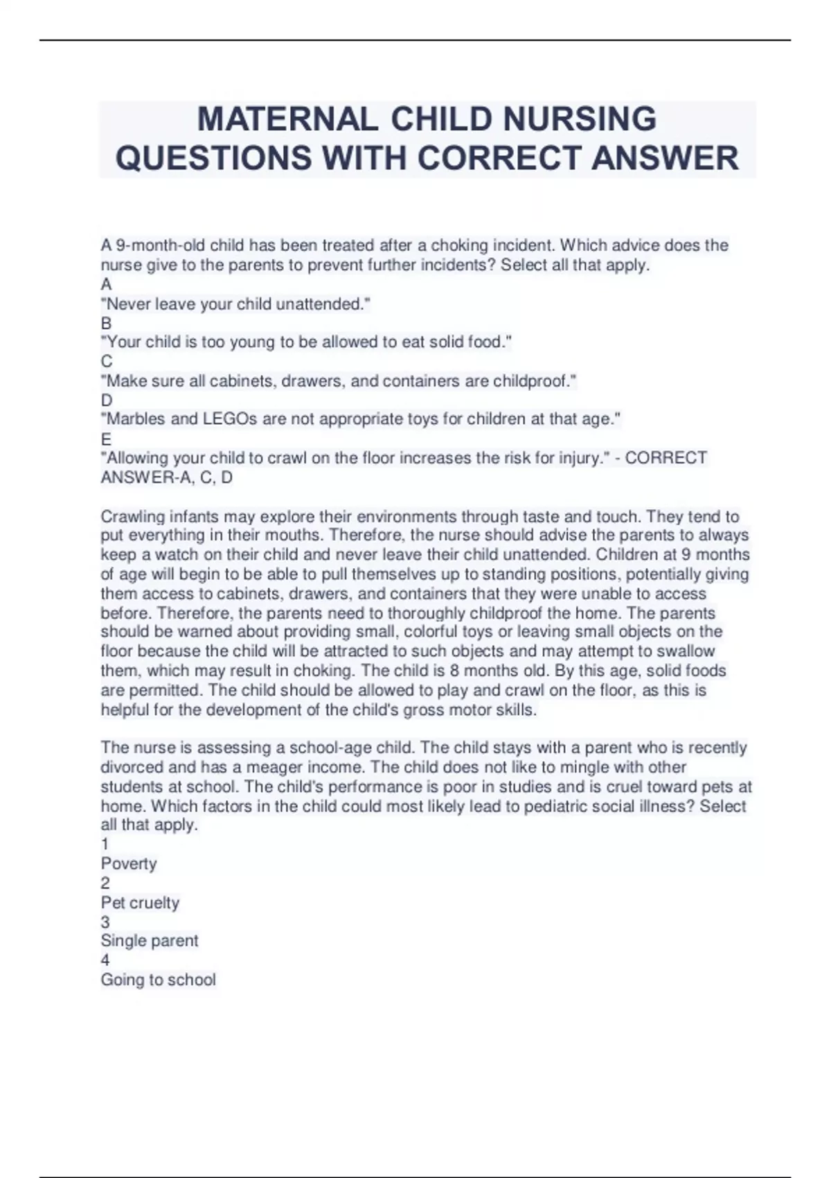 MATERNAL CHILD NURSING QUESTIONS WITH CORRECT ANSWER A 9-month-old child has been treated after a choking incident. Which advice does the nurse give to the parents to prevent further incidents? Select all that apply. A "Never leave your child unattended." B "Your child is too young to be allowed to eat solid food." C "Make sure all cabinets, drawers, and containers are childproof." D "Marbles and LEGOs are not appropriate toys for children at that age." E "Allowing your child to crawl on the floor increases the risk for injury." - CORRECT ANSWER-A, C, D Crawling infants may explore their environments through taste and touch. They tend to put everything in their mouths. Therefore, the nurse should advise the parents to always keep a watch on their child and never leave their child unattended. Children at 9 months of age will begin to be able to pull themselves up to standing positions, potentially giving them access to cabinets, drawers, and containers that they were unable to access before. Therefore, the parents need to thoroughly childproof the home. The parents should be warned about providing small, colorful toys or leaving small objects on the floor because the child will be attracted to such objects and may attempt to swallow them, which may result in choking. The child is 8 months old. By this age, solid foods are permitted. The child should be allowed to play and crawl on the floor, as this is helpful for the development of the child's gross motor skills. The nurse is assessing a school-age child. The child stays with a parent who is recently divorced and has a meager income. The child does not like to mingle with other students at school. The child's performance is poor in studies and is cruel toward pets at home. Which factors in the child could most likely lead to pediatric social illness? Select all that apply. 1 Poverty 2 Pet cruelty 3 Single parent 4 Going to school 5 Behavior with others - CORRECT ANSWER-1, 2, 3, 5 Pediatric social illness is a new morbidity in children. It refers to "the behavior, social, and educational problems that the children face". Poor socioeconomic status is a social problem. Animal cruelty is a behavioral problem. Problem within the family is a social problem Failure at school is an educational problem, and behavior with other children is also a behavioral problem. Any of these could cause pediatric social illness. Going to school does not cause social illness. It helps the child to gain knowledge, learn moral values, and to lead a successful life. The nurse is caring for a patient who is on long-term catheterization. According to the National Quality Forum, what should the nurse assess in this patient? 1 Oxygen saturation using arterial or venous blood 2 Monitoring of respiratory rate while in a sitting position 3 Signs and symptoms of a urinary tract infection 4 Abnormal changes in the electrocardiogram (ECG) - CORRECT ANSWER-3 According to National Quality Forum, the nurse has to measure the patient-centered outcome. The nurse has to assess the patients in the intensive care unit (ICU) regularly to identify the urinary tract infections associated with the urinary catheter. Signs and symptoms of a urinary tract infection are fever, burning urination, and yellow urine. The urinalysis is done to confirm the presence of urinary tract infection (UTI). Urinary catheterization has no direct association with changes in arterial or venous oxygen saturation, respiratory, or cardiac complication. The pediatric nurse is providing first aid to a child. The child sustained minor injuries while playing on the ground, and has severe pain in the knee joint. Which of the nursing interventions in the care of the child come under atraumatic care? Select all that apply. 1 Controlling pain 2 Allowing the child's privacy 3 Respecting cultural differences 4 Fostering the parent-child relationship 5 Giving vaccination for preventing tetanus - CORRECT ANSWER-1, 2, 3, 4 Atraumatic care refers to the provision of the therapeutic interventions that would minimize or eliminate a patient's physical and psychologic distress. Atraumatic care includes interventions to reduce physical distress such as pain control measures. Interventions such as allowing the child privacy, respecting cultural differences, and fostering the parent-child relationship are examples of interventions those are helpful in minimizing psychologic distress in the child. Preventive measures such as vaccination for preventing tetanus are not an intervention included in a traumatic care. The parent of a newborn child asks the nurse the importance of breastfeeding. What should the nurse tell the parent? Select all that apply. 1 Breast milk is not rich in micronutrients. 2 Breast milk is not recommended for infants with fever. 3 Enzymes in breast milk are helpful in the digestion of milk. 4 Immunoglobulins in milk can prevent infections and diseases. 5 Breastfeeding can decrease infant mortality and morbidity. - CORRECT ANSWER-3, 4, 5 Breast milk contains enzymes that are helpful in the digestion of milk and improve the bioavailability of all nutrients in the milk. Immunoglobulins in milk give immunity against infections and allergies. Hence, breastfeeding can decrease infant mortality and morbidity. Breast milk is rich in micronutrients. Breast milk has immunologic properties, so it can be given to the infants with fever. The nurse has to follow a method of problem identification and problem solving. Arrange the steps of the nursing process model in an appropriate order. 1. Planning 2. Evaluation 3. Diagnosis 4. Assessment 5. Implementation - CORRECT ANSWER-4, 3, 1, 5, 2 The five-step nursing process model is assessment, diagnosis, planning, implementation, and evaluation. The first step is assessment in which the nurse collects, and analyzes subjective and objective data of the patient. This step is very crucial in determining the Client Needs. The second step is the formulation of the nursing diagnosis. In