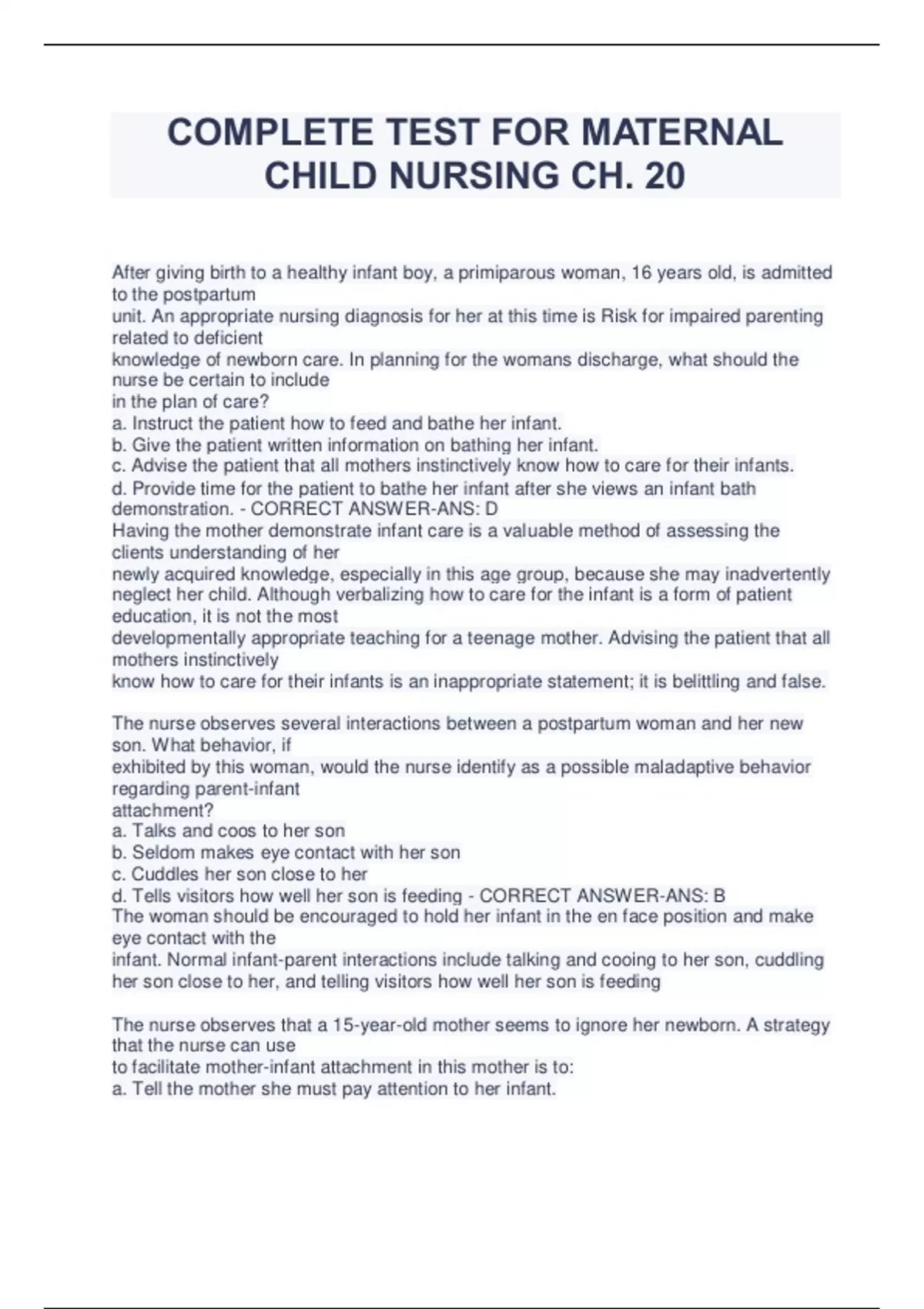 COMPLETE TEST FOR MATERNAL CHILD NURSING CH. 20 After giving birth to a healthy infant boy, a primiparous woman, 16 years old, is admitted to the postpartum unit. An appropriate nursing diagnosis for her at this time is Risk for impaired parenting related to deficient knowledge of newborn care. In planning for the womans discharge, what should the nurse be certain to include in the plan of care? a. Instruct the patient how to feed and bathe her infant. b. Give the patient written information on bathing her infant. c. Advise the patient that all mothers instinctively know how to care for their infants. d. Provide time for the patient to bathe her infant after she views an infant bath demonstration. - CORRECT ANSWER-ANS: D Having the mother demonstrate infant care is a valuable method of assessing the clients understanding of her newly acquired knowledge, especially in this age group, because she may inadvertently neglect her child. Although verbalizing how to care for the infant is a form of patient education, it is not the most developmentally appropriate teaching for a teenage mother. Advising the patient that all mothers instinctively know how to care for their infants is an inappropriate statement; it is belittling and false. The nurse observes several interactions between a postpartum woman and her new son. What behavior, if exhibited by this woman, would the nurse identify as a possible maladaptive behavior regarding parent-infant attachment? a. Talks and coos to her son b. Seldom makes eye contact with her son c. Cuddles her son close to her d. Tells visitors how well her son is feeding - CORRECT ANSWER-ANS: B The woman should be encouraged to hold her infant in the en face position and make eye contact with the infant. Normal infant-parent interactions include talking and cooing to her son, cuddling her son close to her, and telling visitors how well her son is feeding The nurse observes that a 15-year-old mother seems to ignore her newborn. A strategy that the nurse can use to facilitate mother-infant attachment in this mother is to: a. Tell the mother she must pay attention to her infant. b. Show the mother how the infant initiates interaction and pays attention to her. c. Demonstrate for the mother different positions for holding her infant while feeding. d. Arrange for the mother to watch a video on parent-infant interaction. - CORRECT ANSWER-ANS: B Pointing out the responsiveness of the infant is a positive strategy for facilitating parentinfant attachment. Telling the mother that she must pay attention to her infant may be perceived as derogatory and is not appropriate. Educating the young mother in infant care is important; however, pointing out the responsiveness of her baby is a better tool for facilitating mother-infant attachment. Videos are an educational tool that can demonstrate parent-infant attachment, but encouraging the mother to recognize the infants responsiveness is more appropriate The nurse hears a primiparous woman talking to her son and telling him that his chin is just like his dads chin. This womans statement reflects: a. Mutuality. c. Claiming. b. Synchrony. d. Reciprocity - CORRECT ANSWER-ANS: C Claiming refers to the process by which the child is identified in terms of likeness to other family members. Mutuality occurs when the infants behaviors and characteristics call forth a corresponding set of maternal behaviors and characteristics. Synchrony refers to the fit between the infants cues and the parents responses. Reciprocity is a type of body movement or behavior that provides the observer with cues. New parents express concern that, because of the mothers emergency cesarean birth under general anesthesia, they did not have the opportunity to hold and bond with their daughter immediately after her birth. The nurses response should convey to the parents that: a. Attachment, or bonding, is a process that occurs over time and does not require early contact. b. The time immediately after birth is a critical period for people. c. Early contact is essential for optimum parent-infant relationships. d. They should just be happy that the infant is healthy - CORRECT ANSWER-ANS: A Attachment, or bonding, is a process that occurs over time and does not require early contact. The formerly accepted definition of bonding held that the period immediately after birth was a critical time for bonding to occur. Research since has indicated that parent-infant attachment occurs over time. A delay does not inhibit the process. Parent-infant attachment involves activities such as touching, holding, and gazing; it is not exclusively eye contact. A response that conveys that the parents should just be happy that the infant is healthy is inappropriate because it is derogatory and belittling During a phone follow-up conversation with a woman who is 4 days postpartum, the woman tells the nurse, I dont know whats wrong. I love my son, but I feel so let down. I seem to cry for no reason! The nurse would recognize that the woman is experiencing: a. Taking-in. c. Postpartum (PP) blues. b. Postpartum depression (PPD). d. Attachment difficulty. - CORRECT ANSWER-ANS: C During the PP blues women are emotionally labile, often crying easily and for no apparent reason. This lability seems to peak around the fifth PP day. The taking-in phase is the period after birth when the mother focuses on her own psychologic needs. Typically this period lasts 24 hours. PPD is an intense, pervasive sadness marked by severe, labile mood swings; it is more serious and persistent than the PP blues. Crying is not a maladaptive attachment response; it indicates PP blues. The nurse can help a father in his transition to parenthood by: a. Pointing out that the infant turned at the sound of his voice. b. Encouraging him to go home to get some sleep. c. Telling him to tape the infants diaper a different way. d. Suggesting that he let the infant sleep in the bassinet - CORRECT ANSWER-ANS: A Infants respond to t