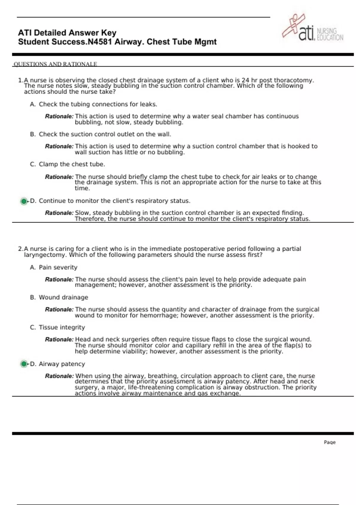 ATI Detailed Answer Key Student Success.N4581 Airway. Chest Tube Mgmt WITH QUESTIONS AND ANSWERS 2024/2025