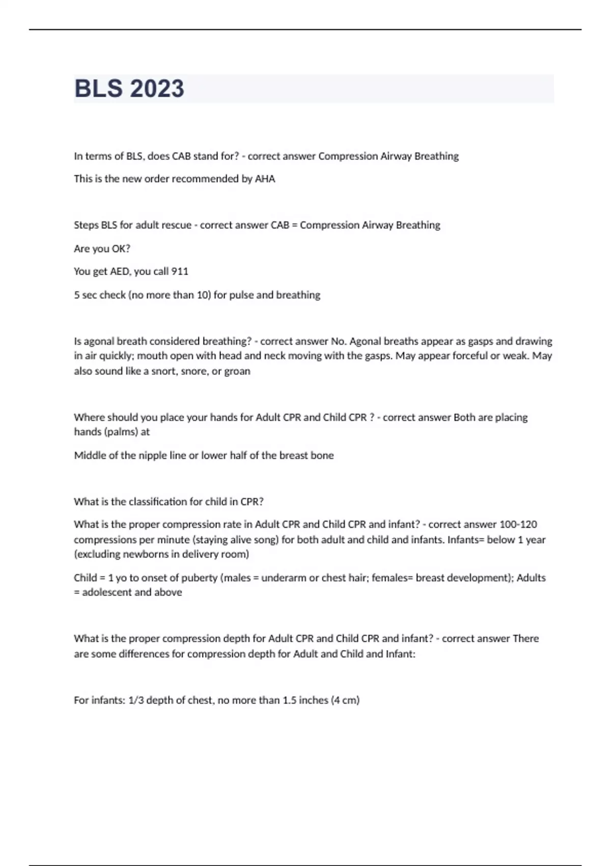 In terms of BLS, does CAB stand for? - correct answer Compression Airway Breathing This is the new order recommended by AHA Steps BLS for adult rescue - correct answer CAB = Compression Airway Breathing Are you OK? You get AED, you call 911 5 sec check (no more than 10) for pulse and breathing Is agonal breath considered breathing? - correct answer No. Agonal breaths appear as gasps and drawing in air quickly; mouth open with head and neck moving with the gasps. May appear forceful or weak. May also sound like a snort, snore, or groan Where should you place your hands for Adult CPR and Child CPR ? - correct answer Both are placing hands (palms) at Middle of the nipple line or lower half of the breast bone What is the classification for child in CPR? What is the proper compression rate in Adult CPR and Child CPR and infant? - correct answer 100-120 compressions per minute (staying alive song) for both adult and child and infants. Infants= below 1 year (excluding newborns in delivery room) Child = 1 yo to onset of puberty (males = underarm or chest hair; females= breast development); Adults = adolescent and above What is the proper compression depth for Adult CPR and Child CPR and infant? - correct answer There are some differences for compression depth for Adult and Child and Infant: For infants: 1/3 depth of chest, no more than 1.5 inches (4 cm)