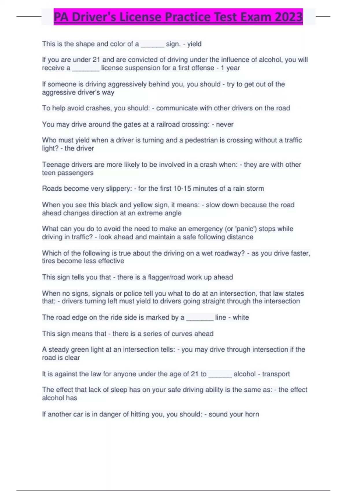 PA Driver's License Practice Test Exam 2023.