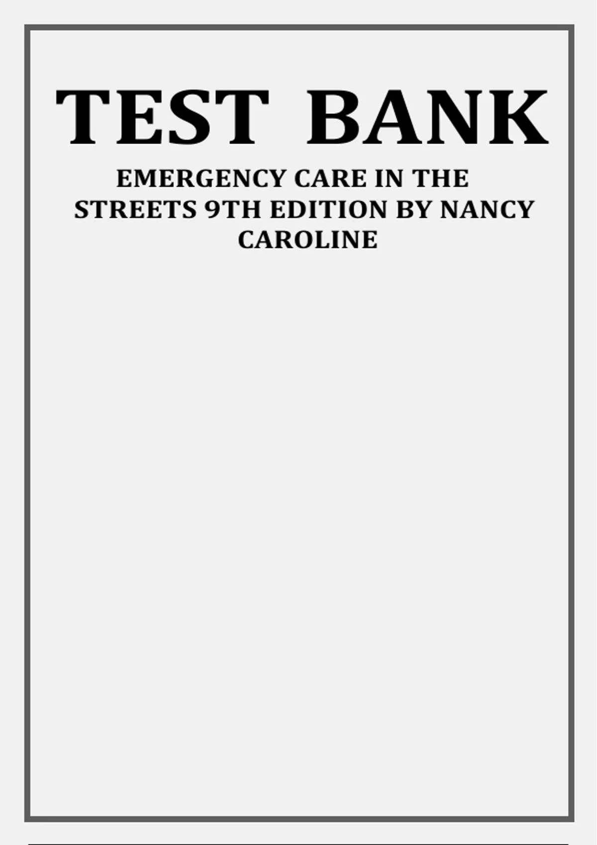 TEST BANK NANCY CAROLINE EMERGENCY CARE IN THE STREETS 9TH EDITION BY NANCY L CAROLINE ISBN_ 978-1284274042 Latest Verified Review 2023 Practice Questions and Answers for Exam Preparation, 100% Correct with Explanations, Highly Recommended, Download to Score A+ Emergency Care In The Streets 9th Edition By Nancy Caroline Test Bank Table of Chapters: Chapter 1: EMS Systems Chapter 2: Workforce Safety and Wellness Chapter 3: Public Health Chapter 4: Medical, Legal, and Ethical Issues Chapter 5: Communications Chapter 6: Documentation Chapter 7: Medical Terminology Chapter 8: Anatomy and Physiology Chapter 9: Pathophysiology Chapter 10: Life Span Development Chapter 11: Patient Assessment Chapter 12: Critical Thinking and Clinical Decision Making Chapter 13: Principles of Pharmacology Chapter 14: Medication Administration Chapter 15: Airway Management Chapter 16: Respiratory Emergencies Chapter 17: Cardiovascular Emergencies Chapter 18: Neurologic Emergencies Chapter 19: Diseases of the Eyes, Ears, Nose, and Throat Chapter 20: Abdominal and Gastrointestinal Emergencies Chapter 21: Genitourinary and Renal Emergencies Chapter 22: Gynecologic Emergencies Chapter 23: Endocrine Emergencies Chapter 24: Hematologic Emergencies Chapter 25: Immunologic Emergencies Chapter 26: Infectious Diseases Chapter 27: Toxicology Chapter 28: Psychiatric Emergencies Chapter 29: Trauma Systems and Mechanism of Injury Chapter 30: Bleeding Chapter 31: Soft-Tissue Trauma Chapter 32: Burns Chapter 33: Face and Neck Trauma Chapter 34: Head and Spine Trauma Chapter 35: Chest Trauma Chapter 36: Abdominal and Genitourinary Trauma Chapter 37: Orthopaedic Trauma Chapter 38: Environmental Emergencies Chapter 39: Responding to the Field Code Chapter 40: Management and Resuscitation of the Critical Patient Chapter 41: Obstetrics Chapter 42: Neonatal Care Chapter 43: Pediatric Emergencies Chapter 44: Geriatric Emergencies Chapter 45: Patients With Special Challenges Chapter 46: Transport Operations Chapter 47: Incident Management and Mass-Casualty Incidents Chapter 48: Vehicle Extrication and Special Rescue Chapter 49: Hazardous Materials Chapter 50: Terrorism Response Chapter 51: Disaster Response Chapter 52: Crime Scene Awareness Chapter 53: Career Development