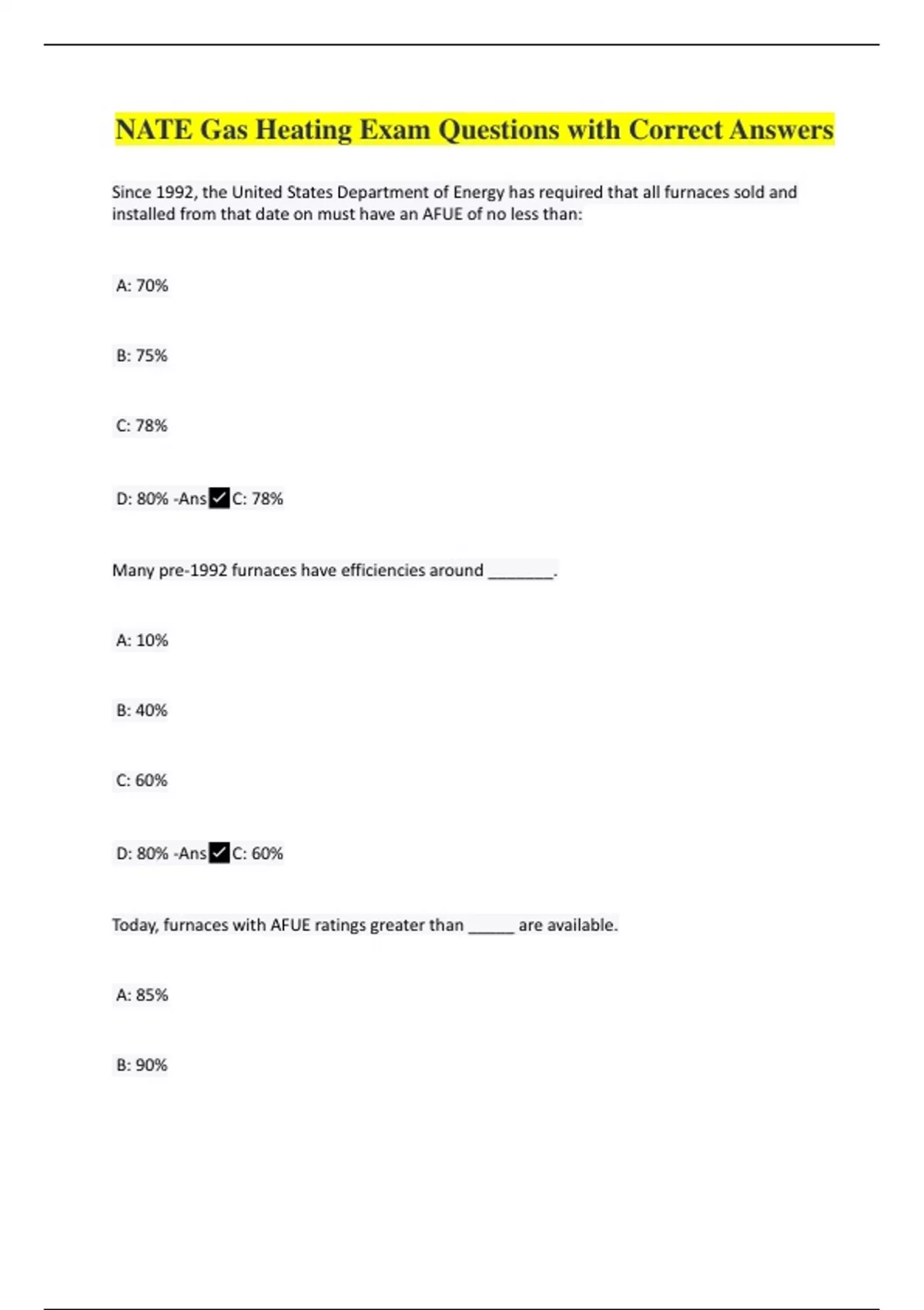 NATE Gas Heating Exam Questions with Correct Answers Since 1992, the United States Department of Energy has required that all furnaces sold and installed from that date on must have an AFUE of no less than: A: 70% B: 75% C: 78% D: 80% -AnsC: 78% Many pre-1992 furnaces have efficiencies around _______. A: 10% B: 40% C: 60% D: 80% -AnsC: 60% Today, furnaces with AFUE ratings greater than _____ are available. A: 85% B: 90% C: 100% D: 110% -AnsB: 90% A thermocouple is used with: A: Intermittent pilot systems B: Direct spark ignition systems C: Glow coil ignition systems D: Standing pilot ignition systems -AnsD: Standing pilot ignition systems The purpose of the gas pressure regulator is to: