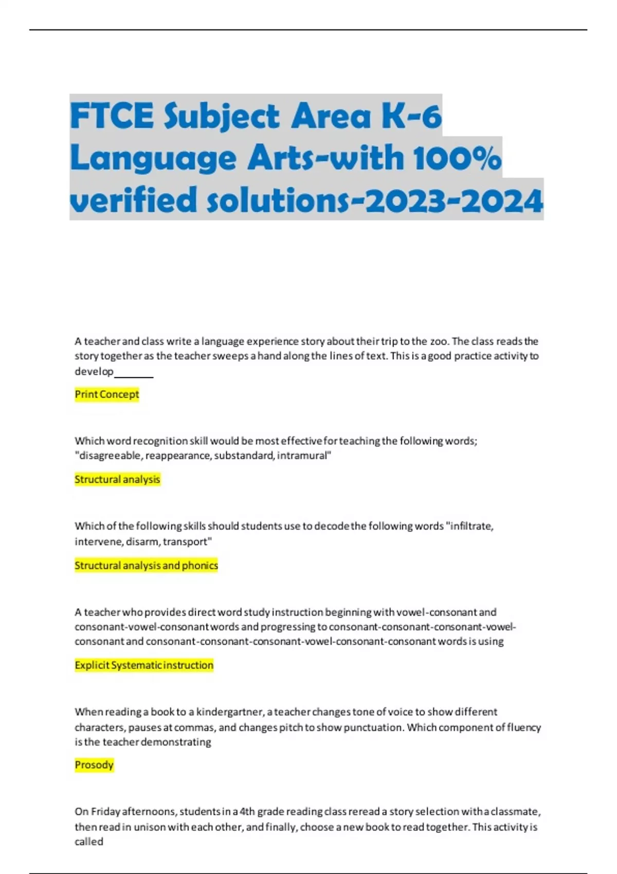 FTCE Subject Area K-6 Language Arts-with 100% verified solutions-