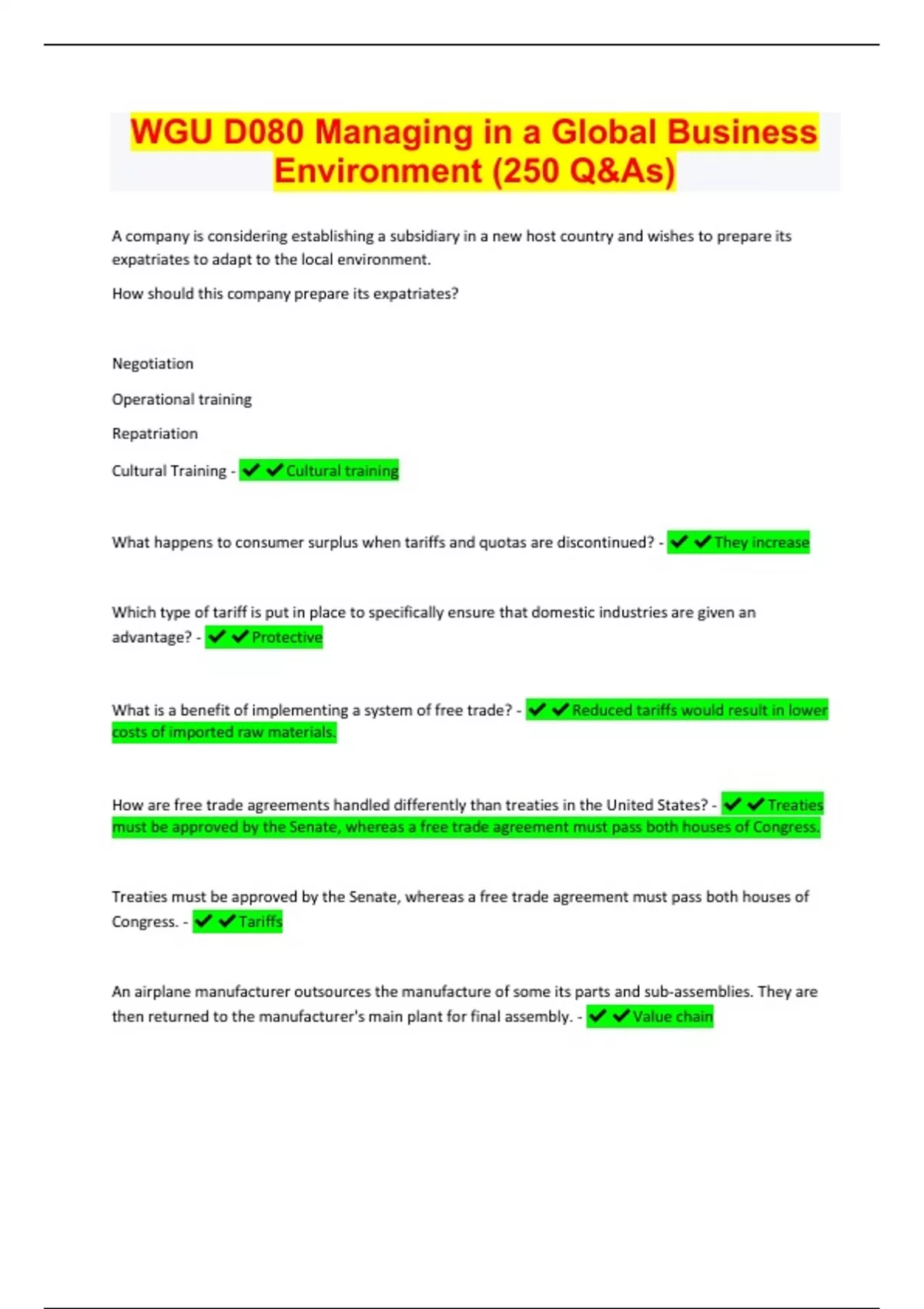 WGU D080 Managing in a Global Business Environment (250 Q&As)| Questions with 100% Correct Answers | Latest Update 2024 | Verified