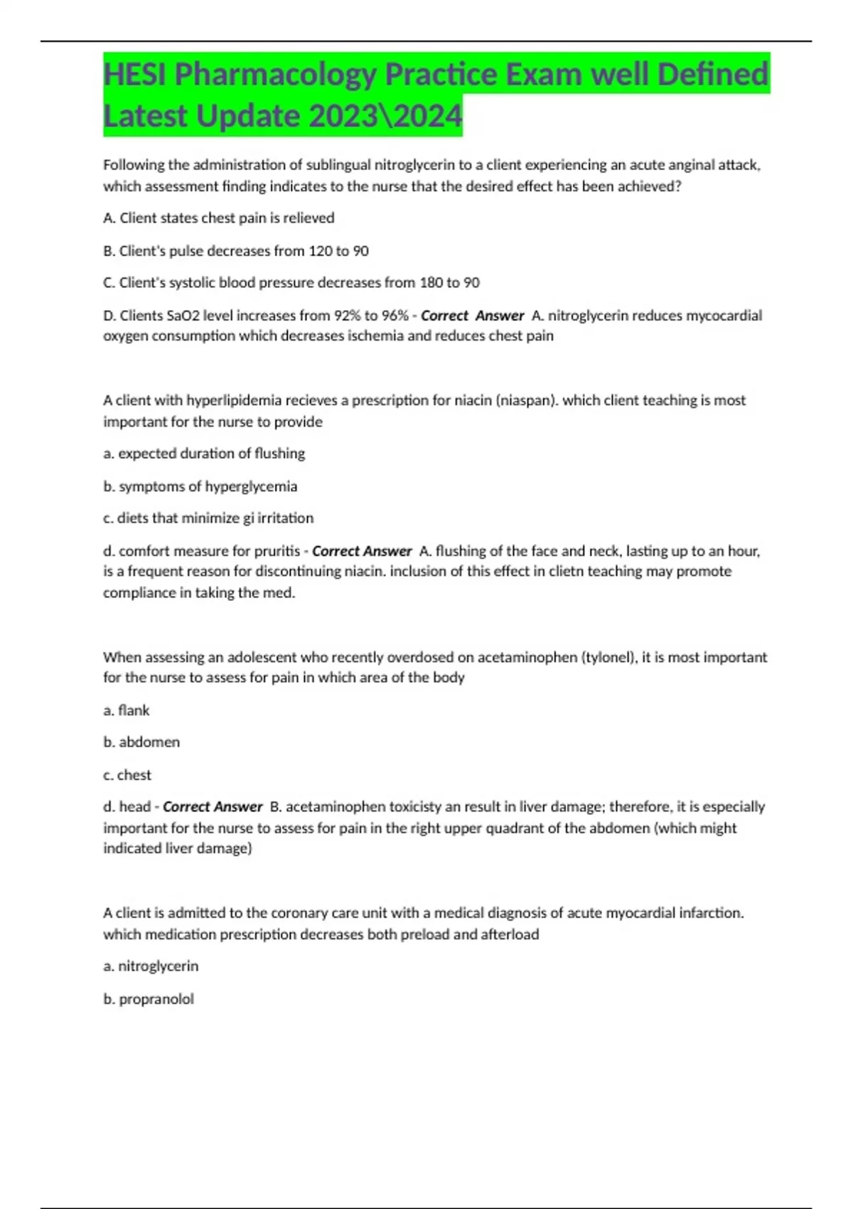 Summary HESI Pharmacology Practice Exam well Defined Latest Update