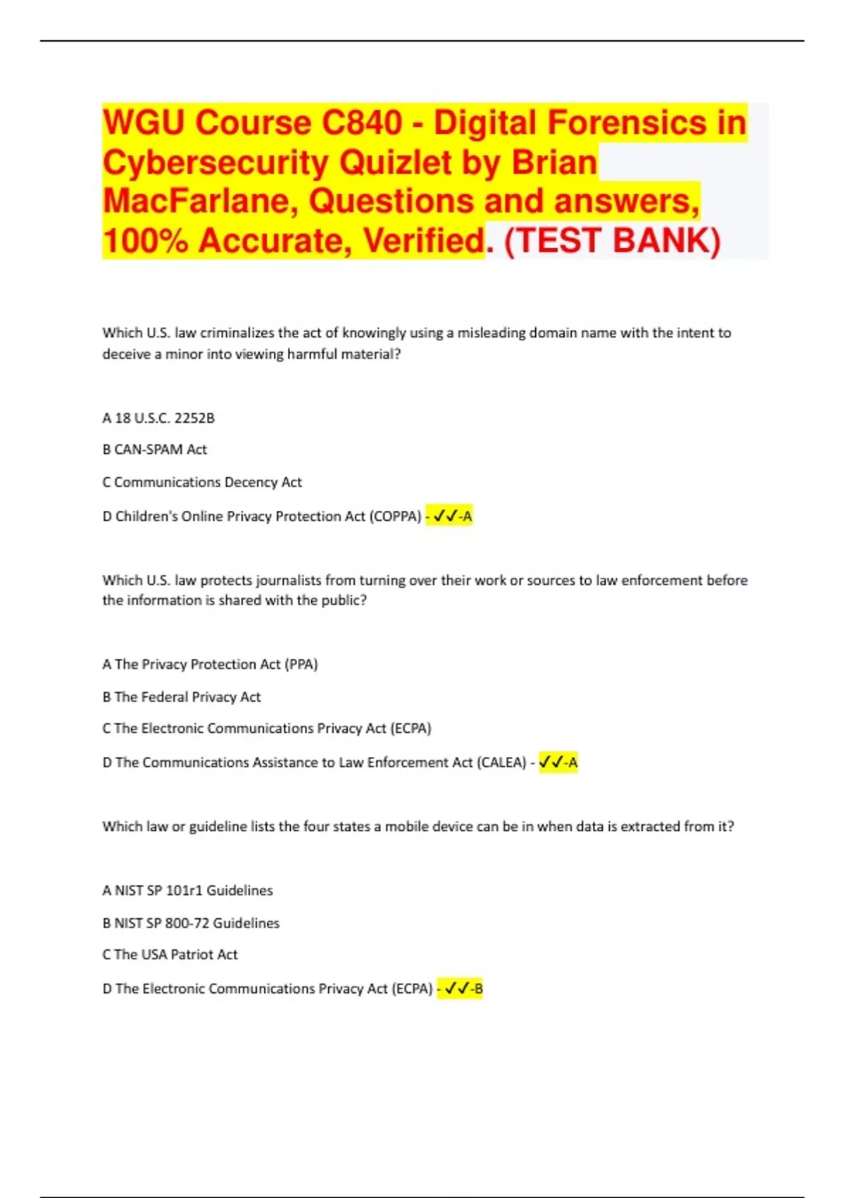 WGU Course C840 - Digital Forensics in Cybersecurity Quizlet by Brian MacFarlane, Questions and answers, 100% Accurate, Verified. (TEST BANK) | 95 Pages