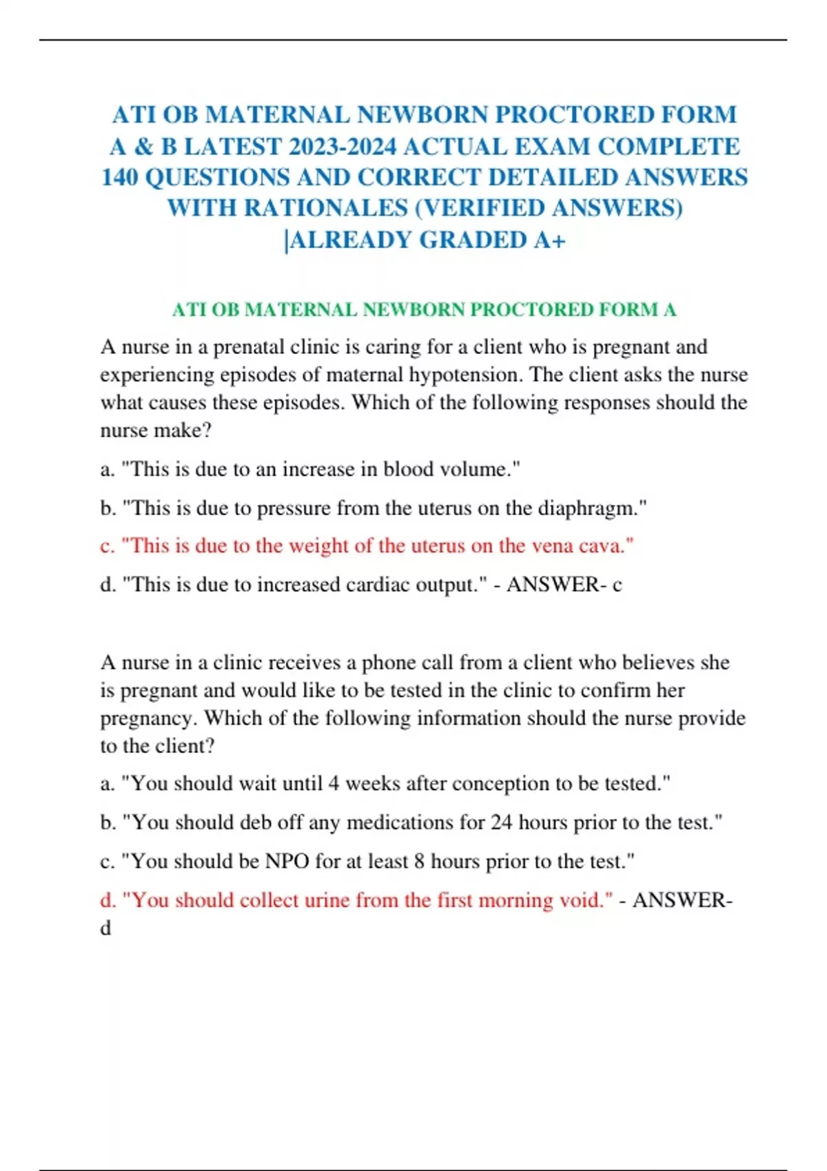 ATI OB MATERNAL NEWBORN PROCTORED FORM A & B LATEST ACTUAL EXAM COMPLETE 140 QUESTIONS AND CORRECT DETAILED ANSWERS WITH RATIONALES (VERIFIED ANSWERS) |ALREADY GRADED A+