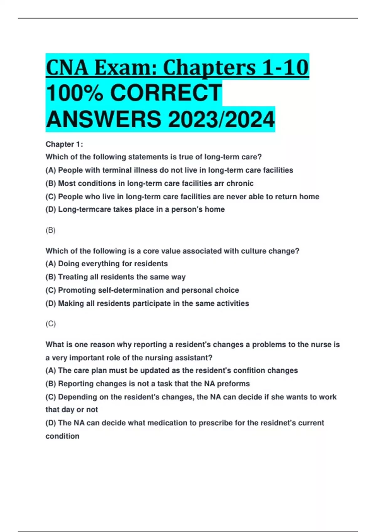 CNA Exam: Chapters 1-10 100% CORRECT ANSWERS 2023/2024