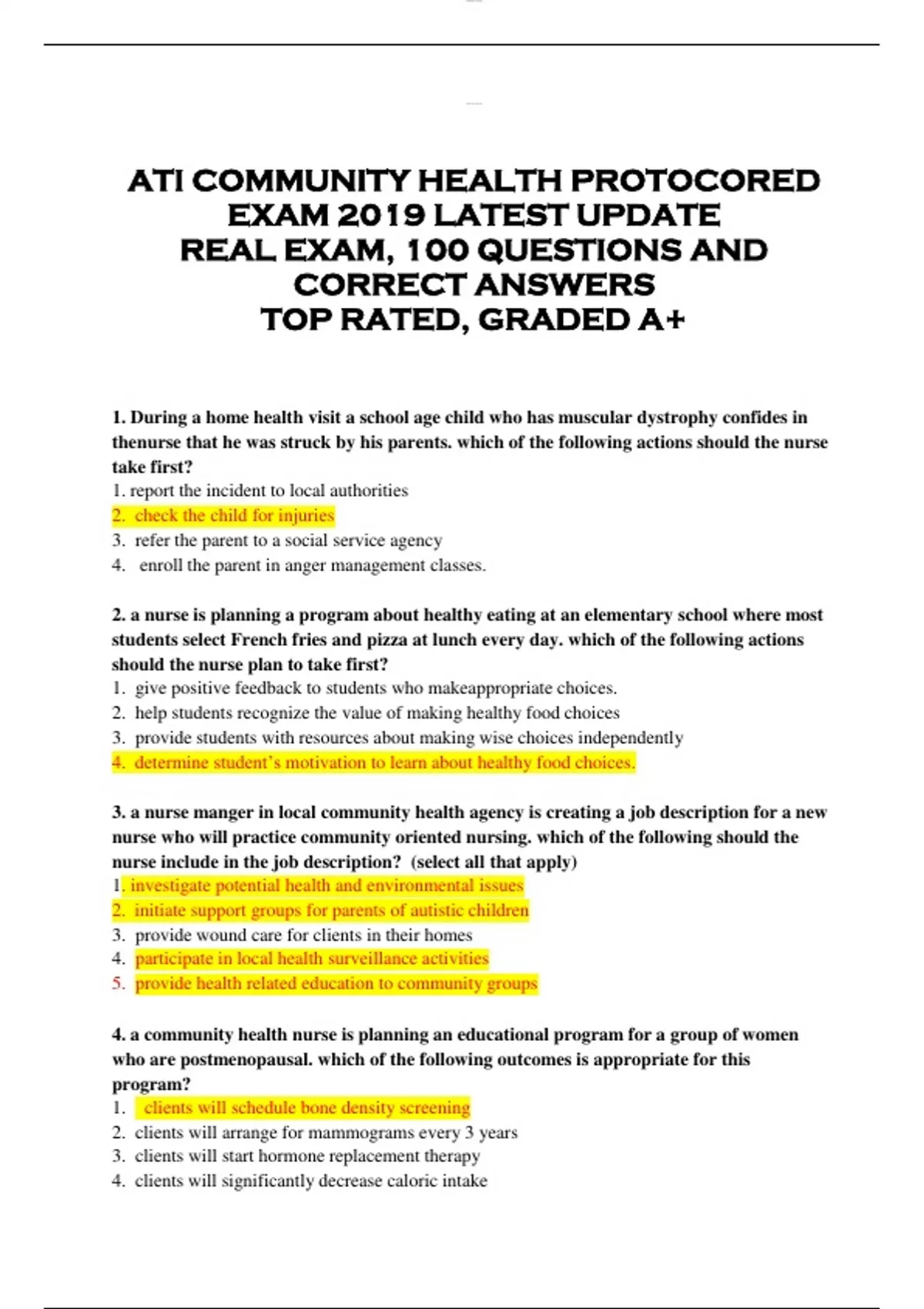 ATI COMMUNITY HEALTH PROTOCORED EXAM 2019 LATEST UPDATE REAL EXAM, 100 QUESTIONS AND CORRECT ANSWERS TOP RATED, GRADED A+