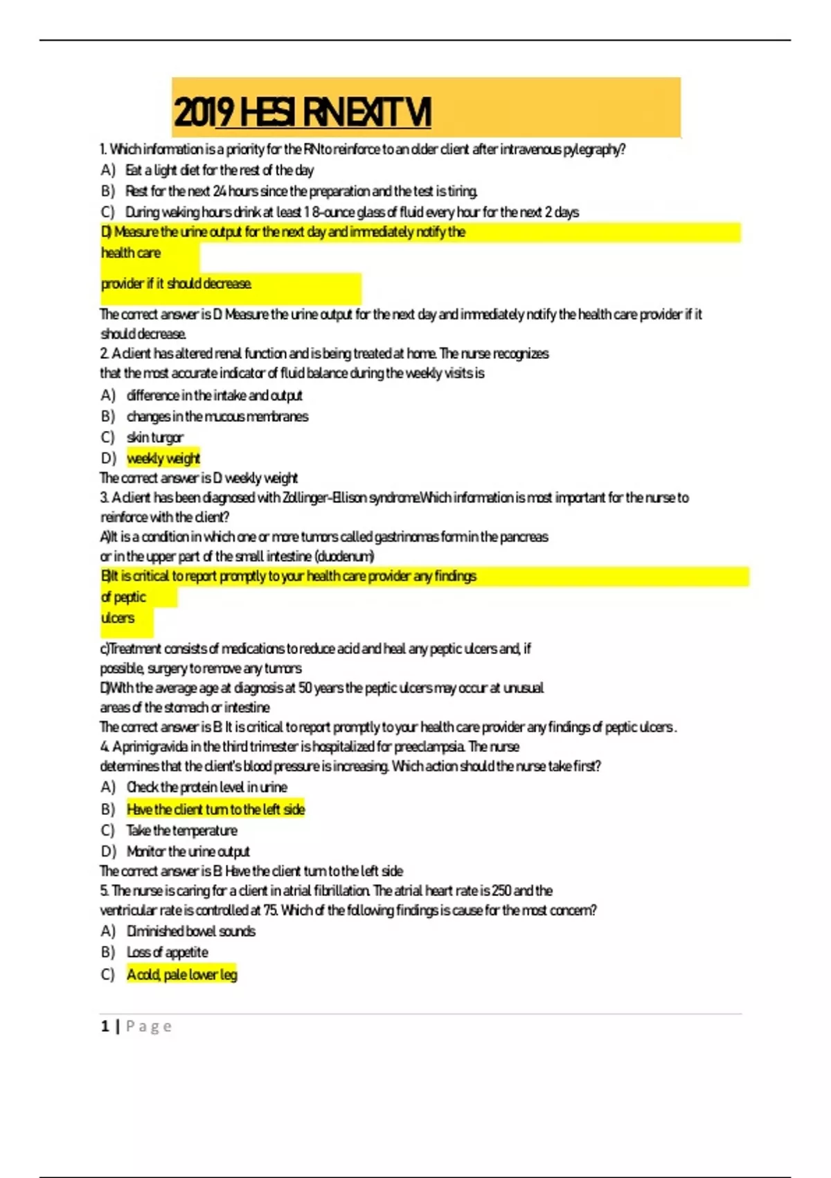 2019 HESI RN EXIT V11. Which information is a priority for the RN to reinforce to an older client after intravenous pylegraphy? A) Eat a light diet for the rest of the day B) Rest for the next 24 hours since the preparation and the test is tiring. C) During waking hours drink at least 1 8-ounce glass of fluid every hour for the next 2 days D) Measure the urine output for the next day and immediately notify the health care provider if it should decrease. The correct answer is D: Measure the urine output for the next day and immediately notify the health care provider if it should decrease. 2. A client has altered renal function and is being treated at home. The nurse recognizes that the most accurate indicator of fluid balance during the weekly visits is A) difference in the intake and output B) changes in the mucous membranes C) skin turgor D) weekly weight The correct answer is D: weekly weight 3. A client has been diagnosed with Zollinger-Ellison syndrome.Which information is most important for the nurse to reinforce with the client? A)It is a condition in which one or more tumors called gastrinomas form in the pancreas or in the upper part of the small intestine (duodenum) B)It is critical to report promptly to your health care provider any findings of peptic ulcers c)Treatment consists of medications to reduce acid and heal any peptic ulcers and, if possible, surgery to remove any tumors D)With the average age at diagnosis at 50 years the peptic ulcers may occur at unusual areas of the stomach or intestine The correct answer is B: It is critical to report promptly to your health care provider any findings of peptic ulcers . 4. A primigravida in the third trimester is hospitalized for preeclampsia. The nurse determines that the client’s blood pressure is increasing. Which action should the nurse take first? A) Check the protein level in urine B) Have the client turn to the left side C) Take the temperature D) Monitor the urine output The correct answer is B: Have the client turn to the left side 5. The nurse is caring for a client in atrial fibrillation. The atrial heart rate is 250 and the ventricular rate is controlled at 75. Which of the following findings is cause for the most concern? A) Diminished bowel sounds B) Loss of appetite C) A cold, pale lower leg 1 | P a g eD) Tachypnea The correct answer is C: A cold, pale lower leg 6. The client with infective endocarditis must be assessed frequently by the home health nurse. Which finding suggests that antibiotic therapy is not effective, and must be reported by the nurse immediately to the healthcare provider? A) Nausea and vomiting B) Fever of 103 degrees Fahrenheit (39.5 degrees Celsius) C) Diffuse macular rash D) Muscle tenderness The correct answer is B: Fever of 103 degrees F (39.5 degrees C) 7. A client who had a vasectomy is in the post recovery unit at an outpatient clinic. Which of these points is most important to be reinforced by the nurse? A) Until the health care provider has determined that your ejaculate doesn't contain sperm, continue to use another form of contraception. B)This procedure doesn't impede the production of male hormones or the production of sperm in the testicles. The sperm can no longer enter your semen and no sperm are in your ejaculate. C) After your vasectomy, strenuous activity needs to be avoided for at least 48 hours. If your work doesn't involve hard physical labor, you can return to your job as soon as you feel up to it. The stitches generally dissolve in seven to ten days. D)The health care provider at this clinic recommends rest, ice, an athletic supporter or over-the-counter pain medication to relieve any discomfort. The correct answer is A: Until the health care provider has determined that your ejaculate doesn't contain sperm, continue to use another form of contraception. 8. A client who is to have antineoplastic chemotherapy tells the nurses of a fear of being sick all the time and wishes to try acupuncture. Which of these beliefs stated by the client would be incorrect about acupuncture? A)Some needles go as deep as 3 inches, depending on where they're placed in the body and what the treatment is for. The needles usually are left in for 15 to 30 minutes. B) In traditional Chinese medicine, imbalances in the basic energetic flow of life — known as qi or chi — are thought to cause illness. * C) The flow of life is believed to flow through major pathways or nerve clusters in your body. D) By inserting extremely fine needles into some of the over 400 acupuncture points in various combinations it is believed that energy flow will rebalance to allow the body's natural healing mechanisms to take over. The correct answer is C: The flow of life is believed to flow through major pathways or nerve clusters in your body. 9. The nurse is discussing with a group of students the disease Kawasaki. What statement made by a student about Kawasaki disease is incorrect? A)It also called mucocutaneous lymph node syndrome because it affects the mucous membranes (inside the mouth, throat and nose), skin and lymph nodes. B)In the second phase of the disease, findings include peeling of the skin on the hands and feet with joint and abdominal pain C)Kawasaki disease occurs most often in boys, children younger than age 5 and children 2 | P a g eof Hispanic descent D)Initially findings are a sudden high fever, usually above 104 degrees Fahrenheit, which lasts 1 to2 weeks The correct answer is C: Kawasaki disease occurs most often in boys, children younger than age 5 and children of Hispanic descent 10. A client has viral pneumonia affecting 2/3 of the right lung. What would be the best position to teach the client to lie in every other hour during first 12 hours after admission? A) Side-lying on the left with the head elevated 10 degrees B) Side-lying on the left with the head elevated 35 degrees C) Side-lying on the right wil the head elevated 10 degrees D) Side-lying on the right with the head elevated 35