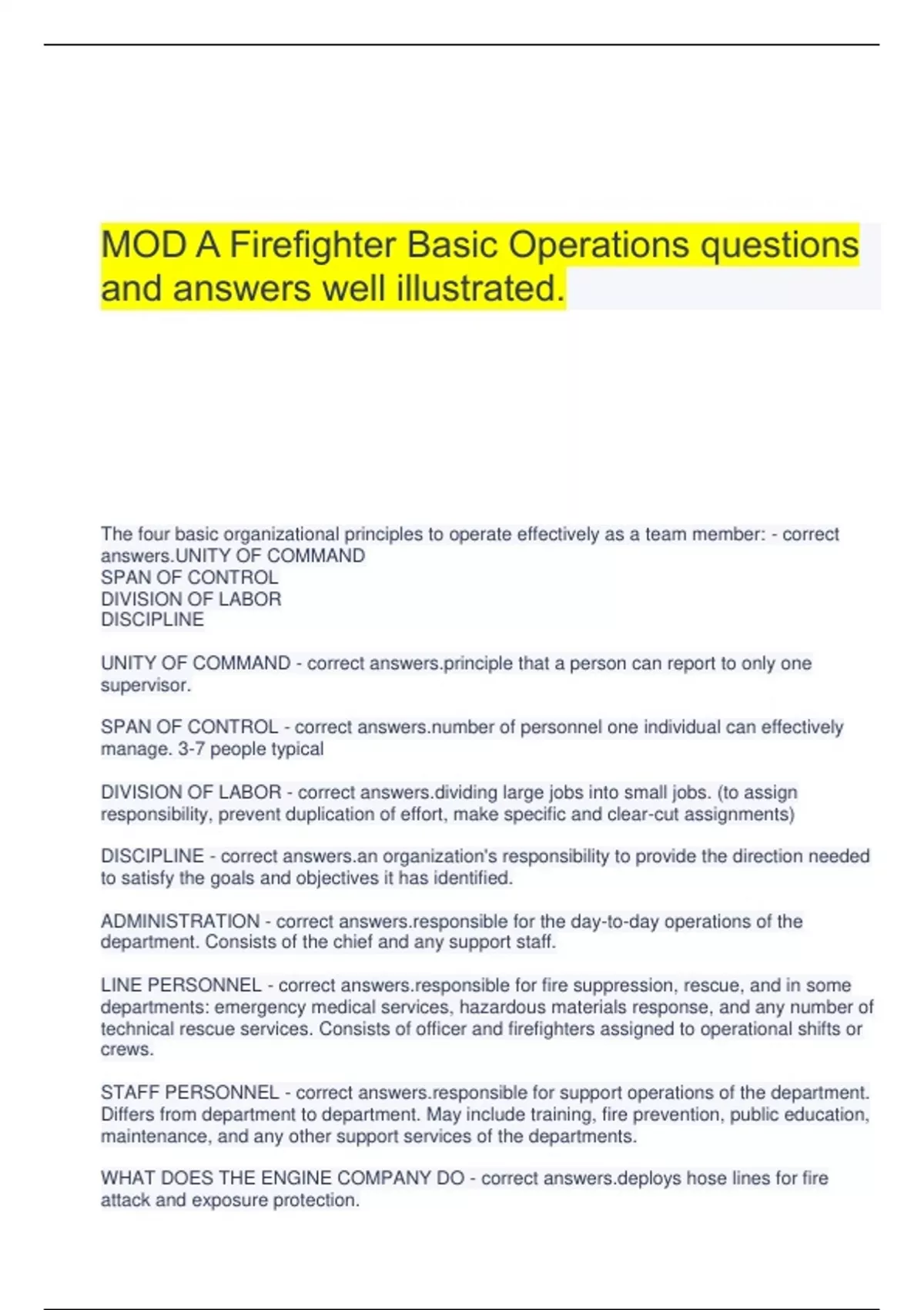 MOD A Firefighter Basic Operations questions and answers well illustrated. The four basic organizational principles to operate effectively as a team member: - correct answers.UNITY OF COMMAND SPAN OF CONTROL DIVISION OF LABOR DISCIPLINE UNITY OF COMMAND - correct iple that a person can report to only one supervisor. SPAN OF CONTROL - correct r of personnel one individual can effectively manage. 3-7 people typical DIVISION OF LABOR - correct ing large jobs into small jobs. (to assign responsibility, prevent duplication of effort, make specific and clear-cut assignments) DISCIPLINE - correct organization's responsibility to provide the direction needed to satisfy the goals and objectives it has identified. ADMINISTRATION - correct nsible for the day-to-day operations of the department. Consists of the chief and any support staff. LINE PERSONNEL - correct nsible for fire suppression, rescue, and in some departments: emergency medical services, hazardous materials response, and any number of technical rescue services. Consists of officer and firefighters assigned to operational shifts or crews. STAFF PERSONNEL - correct nsible for support operations of the department. Differs from department to department. May include training, fire prevention, public education, maintenance, and any other support services of the departments. WHAT DOES THE ENGINE COMPANY DO - correct ys hose lines for fire attack and exposure protection. WHAT DOES THE TRUCK (LADDER) COMPANY DO - correct rms forcible entry, search and rescue, ventilation, salvage and overhaul, and provides access to upper levels of a structure. WHAT DOES THE RESCUE SQUAD/COMPANY DO - correct ally is responsible for the removal of victims from areas of danger or entrapment. WHAT DOES THE BRUSH COMPANY DO - correct guishes wild land fires and protects structures in the urban-interface WHAT DOES THE HAZARDOUS MATERIALS COMPANY DO - correct nds to and mitigates hazardous materials incidents. WHAT DOES THE EMERGENCY MEDICAL COMPANY DO - correct des emergency medical care and support to patients. What is the mission of the fire service? - correct answers.To practice life safety, incident stabilization, and property conservation. INCIDENT COMMAND COMPONENTS - correct answers.-Incident commander -Safety -Information -Liaison -Operation -Planning -Logistics -Finance and Administration Two types of training records that are required to be maintained by the Division of Personnel Standards and Education: - correct answers.-Learning objectives. -Practical evaluations and written exams. NFPA 1001 - correct answers.Standard for Fire Fighter Professional Qualifications FIRE - correct answers.a form of combustion, self-sustaining process of rapid oxidation of a fuel that produces heat and light COMBUSTION - correct -sustaining chemical reaction yielding energy or products that cause further reactions. HEAT - correct form of energy that raises temperature, the energy transferred from one body to another when the temperature of the bodies are different IGNITION TEMPERATURE - correct minimum temperature to which a fuel, in air, must be heated to start self-sustained combustion without a separate ignition source. LOWER FLAMMABLE LIMIT ( LFL ) - correct um concentration of fuel vapor and air that will ignite. Limits below the lower flammable limit (LFL) are called too "lean" to burn. UPPER FLAMMABLE LIMIT ( UFL) - correct ntration above which combustion cannot take place. Limits above the upper flammable limit (UFL) are called too "rich" to burn
