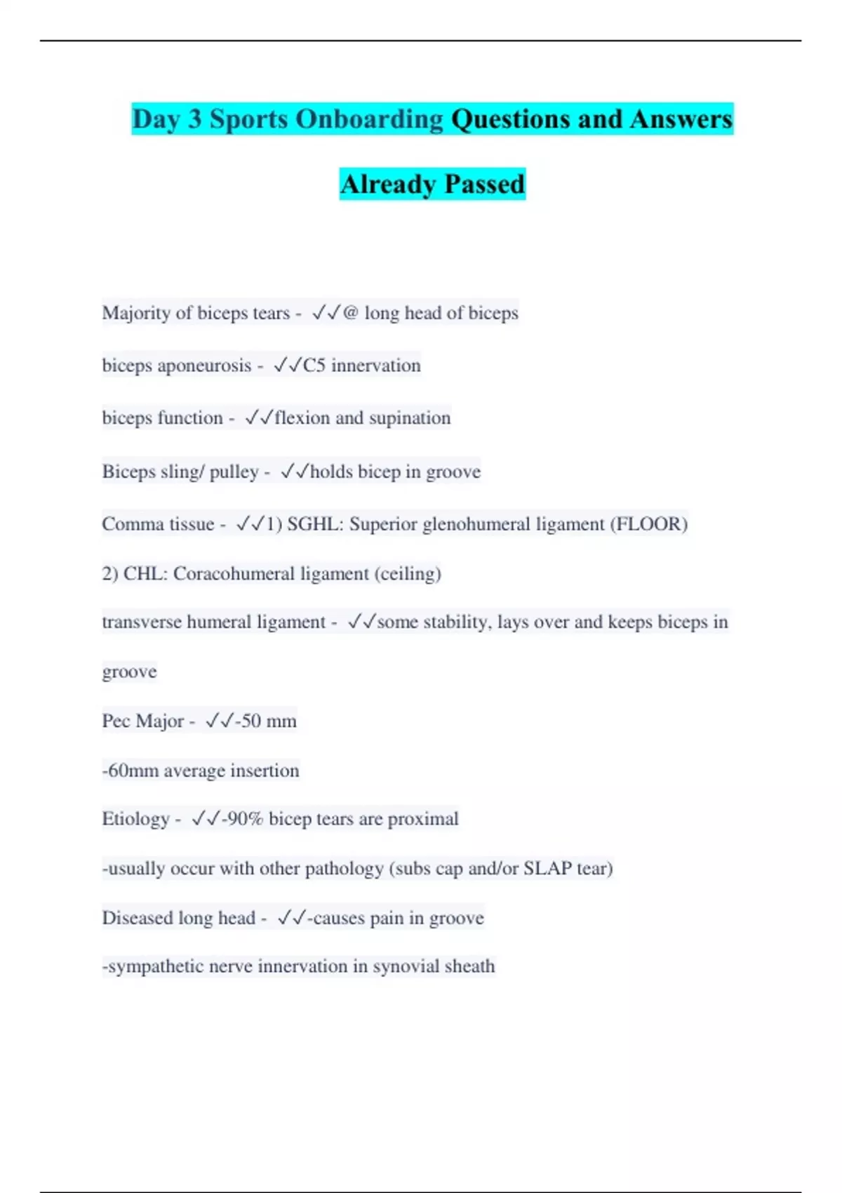 Day 3 Sports Onboarding Questions and Answers Already Passed Majority of biceps tears - @ long head of biceps biceps aponeurosis - C5 innervation biceps function - flexion and supination Biceps sling/ pulley - holds bicep in groove Comma tissue - 1) SGHL: Superior glenohumeral ligament (FLOOR) 2) CHL: Coracohumeral ligament (ceiling) transverse humeral ligament - some stability, lays over and keeps biceps in groove Pec Major - -50 mm -60mm average insertion Etiology - -90% bicep tears are proximal -usually occur with other pathology (subs cap and/or SLAP tear) Diseased long head - -causes pain in groove -sympathetic nerve innervation in synovial sheath