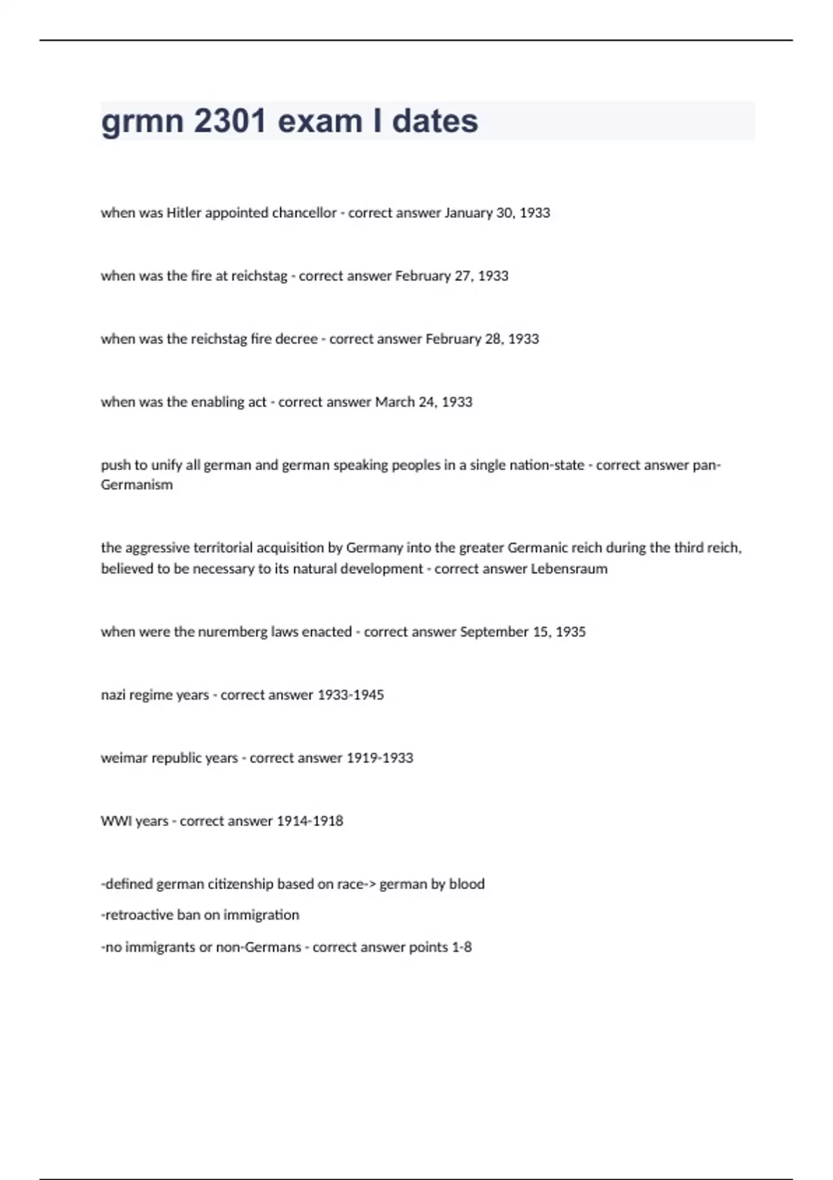 grmn 2301 exam I dateswhen was Hitler appointed chancellor - correct answer January 30, 1933 when was the fire at reichstag - correct answer February 27, 1933 when was the reichstag fire decree - correct answer February 28, 1933 when was the enabling act - correct answer March 24, 1933 push to unify all german and german speaking peoples in a single nation-state - correct answer pan-Germanism the aggressive territorial acquisition by Germany into the greater Germanic reich during the third reich, believed to be necessary to its natural development - correct answer Lebensraum when were the nuremberg laws enacted - correct answer September 15, 1935 nazi regime years - correct answer weimar republic years - correct answer WWI years - correct answer -defined german citizenship based on race-> german by blood -retroactive ban on immigration -no immigrants or non-Germans - correct answer points 1-8 -common good > individual good - correct answer points 10 and 24 -social welfare programs, public education, for old and poor -> only for blood-Germans -gets rid of alternative ways of making money: interest, investments, etc. - correct answer points 11-21 -only racial Germans can work in news/media -others must be distinctly separate - correct answer points 22 and 23