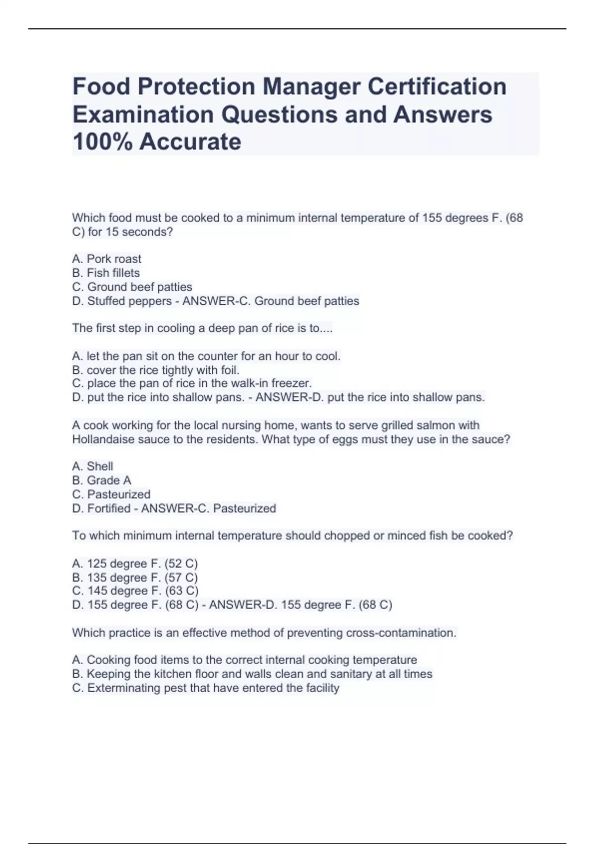 Food Protection Manager Certification Examination Questions and Answers 100% AccurateFood Protection Manager Certification Examination Questions and Answers 100% AccurateFood Protection Manager Certification Examination Questions and Answers 100% AccurateFood Protection Manager Certification Examination Questions and Answers 100% Accurate Which food must be cooked to a minimum internal temperature of 155 degrees F. (68 C) for 15 seconds? A. Pork roast B. Fish fillets C. Ground beef patties D. Stuffed peppers - ANSWER-C. Ground beef patties The first step in cooling a deep pan of rice is to.... A. let the pan sit on the counter for an hour to cool. B. cover the rice tightly with foil. C. place the pan of rice in the walk-in freezer. D. put the rice into shallow pans. - ANSWER-D. put the rice into shallow pans. A cook working for the local nursing home, wants to serve grilled salmon with Hollandaise sauce to the residents. What type of eggs must they use in the sauce?