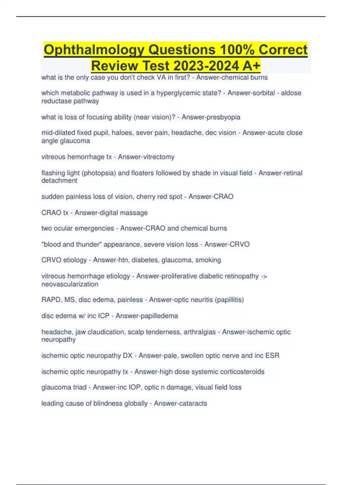 Ophthalmology Questions 100% Correct Review Test A+ what is the only case you don't check VA in first? - Answer-chemical burns which metabolic pathway is used in a hyperglycemic state? - Answer-sorbital - aldose reductase pathway what is loss of focusing ability (near vision)? - Answer-presbyopia mid-dilated fixed pupil, haloes, sever pain, headache, dec vision - Answer-acute close angle glaucoma vitreous hemorrhage tx - Answer-vitrectomy flashing light (photopsia) and floaters followed by shade in visual field - Answer-retinal detachment sudden painless loss of vision, cherry red spot - Answer-CRAO CRAO tx - Answer-digital massage two ocular emergencies - Answer-CRAO and chemical burns "blood and thunder" appearance, severe vision loss - Answer-CRVO CRVO etiology - Answer-htn, diabetes, glaucoma, smoking vitreous hemorrhage etiology - Answer-proliferative diabetic retinopathy - neovascularization RAPD, MS, disc edema, painless - Answer-optic neuritis (papillitis) disc edema w/ inc ICP - Answer-papilledema headache, jaw claudication, scalp tenderness, arthralgias - Answer-ischemic optic neuropathy ischemic optic neuropathy DX - Answer-pale, swollen optic nerve and inc ESR ischemic optic neuropathy tx - Answer-high dose systemic corticosteroids glaucoma triad - Answer-inc IOP, optic n damage, visual field loss leading cause of blindness globally - Answer-cataracts leading cause of blindness in U.S. - Answer-diabetic retinopathy leading cause of blindness in AA - Answer-glaucoma leading cause of blindness in eldery - Answer-macular degeneration leading cause of blindness due to infection - Answer-herpes inc myopia, monocular diplopia, dull colors - Answer-cataracts surgical indication for cataracts - Answer-patient decides it's interfering with their daily life atrophic (dry) macular disease - Answer-gradual vision loss, drusen in Bruch's membrane exudative (wet) - Answer-sudden vision loss; subretinal neovascularization - hemorrhages tx for age related macular degeneration - Answer-NVM/low vision aids; anti-VEGF for wet child w/ h/o URI, otitis media, swollen lid, red eye, periorbital edema - Answer-pre-septal cellulitis adult w/ sinus infection and periorbital edema, swollen lid, erythema - Answer-pre-septal cellulitis impaired eye movement, painful, racoon eyes CONTINUES