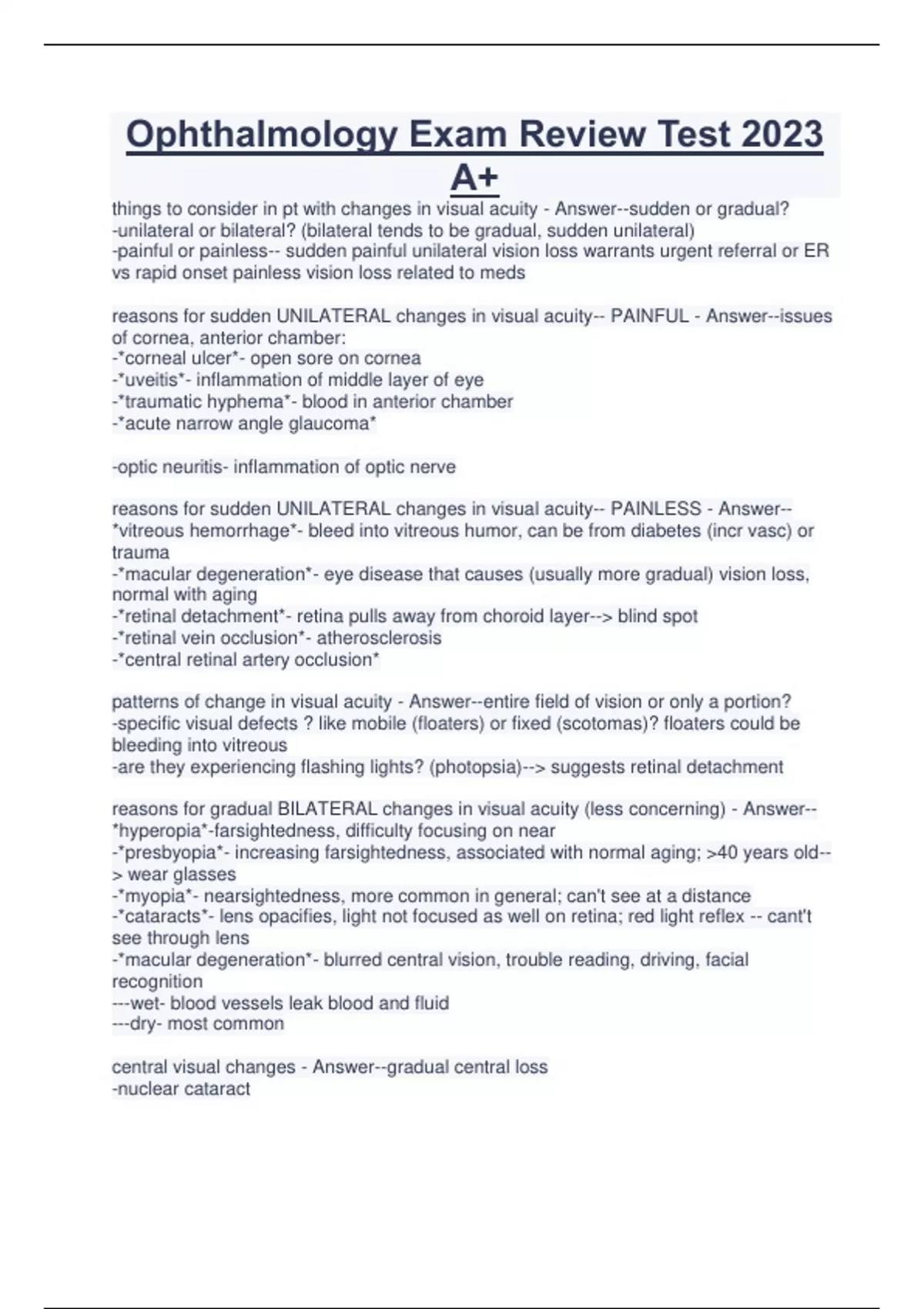Ophthalmology Exam Review Test 2023 A+ things to consider in pt with changes in visual acuity - Answer--sudden or gradual? -unilateral or bilateral? (bilateral tends to be gradual, sudden unilateral) -painful or painless-- sudden painful unilateral vision loss warrants urgent referral or ER vs rapid onset painless vision loss related to meds reasons for sudden UNILATERAL changes in visual acuity-- PAINFUL - Answer--issues of cornea, anterior chamber: -*corneal ulcer*- open sore on cornea -*uveitis*- inflammation of middle layer of eye -*traumatic hyphema*- blood in anterior chamber -*acute narrow angle glaucoma* -optic neuritis- inflammation of optic nerve reasons for sudden UNILATERAL changes in visual acuity-- PAINLESS - Answer-- *vitreous hemorrhage*- bleed into vitreous humor, can be from diabetes (incr vasc) or trauma -*macular degeneration*- eye disease that causes (usually more gradual) vision loss, normal with aging -*retinal detachment*- retina pulls away from choroid layer-- blind spot -*retinal vein occlusion*- atherosclerosis -*central retinal artery occlusion* patterns of change in visual acuity - Answer--entire field of vision or only a portion? -specific visual defects ? like mobile (floaters) or fixed (scotomas)? floaters could be bleeding into vitreous -are they experiencing flashing lights? (photopsia)-- suggests retinal detachment reasons for gradual BILATERAL changes in visual acuity (less concerning) - Answer-- *hyperopia*-farsightedness, difficulty focusing on near -*presbyopia*- increasing farsightedness, associated with normal aging; 40 years old-- wear glasses -*myopia*- nearsightedness, more common in general; can't see at a distance -*cataracts*- lens opacifies, light not focused as well on retina; red light reflex -- cant't see through lens -*macular degeneration*- blurred central vision, trouble reading, driving, facial recognition ---wet- blood vessels leak blood and fluid ---dry- most common central visual changes - Answer--gradual central loss -nuclear cataract -macular degeneration- central decreased vision peripheral visual changes - Answer--gradual peripheral loss -open-angle glaucoma- increased pressure in eye, can damage optic nerve-- emergency Diplopia - Answer-double vision *etiology* -CNS lesion- brainstem, cerebellum -extraocular muscle pathology- horizontal CN III or VI, vertical CN III or IV -pathology of cornea or lens- unilateral, remains with closure of other eye -harder to tx 7 years old, can lead to vision loss -tx: cover one eye-- if not resolved, consider pathology of cornea or lens characteristics of BENIGN red eye - Answer--mild to no pain -minimal if any vision change -peripheral injection or well demarcated area of redness -normal pupils- equal and reactive -cornea clear (part that covers iris) conjunctivitis - Answer--benign -dilated blood vessels in conjunctiva -peripheral redness subconjunctival hemorrhage - Answer--benign -leakage from blood vessel -can be from coughing, sneezing, vomiting characteristics of WORRISOME red eye - Answer--moderate to severe pain -visual acuity decreased -ciliary injection- central limbus or diffuse redness -pupils may be irregular, small or dilated, fixed -cloudy, steamy cornea corneal abrasion - Answer--damage to cornea (can be visualized with fluorescent dye-- picks up dye) -often improves within 24 hours -can be from FB -contact wearers at higher risk acute iritis/uveitis - Answer--ring around limbic area -ciliary injection -CMV, systemic infectious disease acute angle closure glaucoma - Answer--cloudy, steamy cornea -ciliary injection CONTINUES..