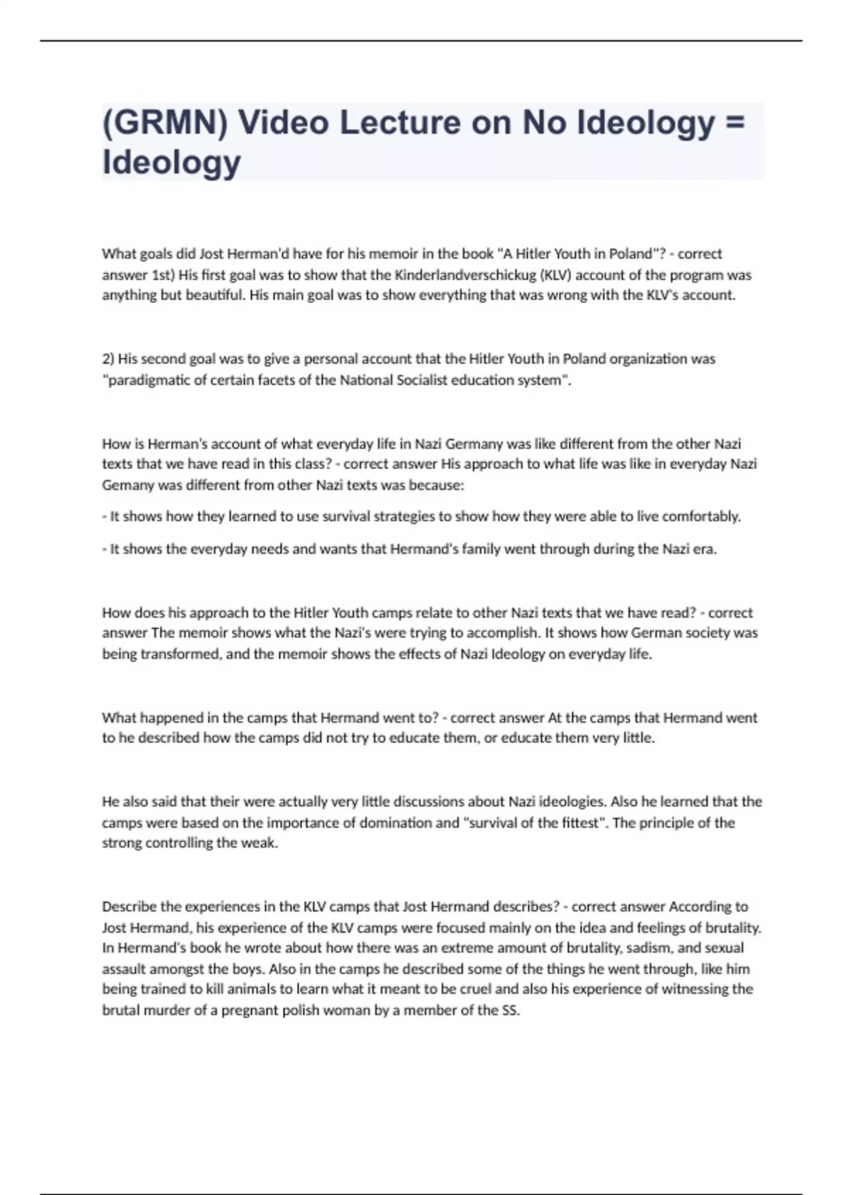 (GRMN) Video Lecture on No Ideology = Ideology What goals did Jost Herman’d have for his memoir in the book "A Hitler Youth in Poland"? - correct answer 1st) His first goal was to show that the Kinderlandverschickug (KLV) account of the program was anything but beautiful. His main goal was to show everything that was wrong with the KLV's account. 2) His second goal was to give a personal account that the Hitler Youth in Poland organization was "paradigmatic of certain facets of the National Socialist education system". How is Herman’s account of what everyday life in Nazi Germany was like different from the other Nazi texts that we have read in this class? - correct answer His approach to what life was like in everyday Nazi Gemany was different from other Nazi texts was because: - It shows how they learned to use survival strategies to show how they were able to live comfortably. - It shows the everyday needs and wants that Hermand's family went through during the Nazi era. How does his approach to the Hitler Youth camps relate to other Nazi texts that we have read? - correct answer The memoir shows what the Nazi's were trying to accomplish. It shows how German society was being transformed, and the memoir shows the effects of Nazi Ideology on everyday life. What happened in the camps that Hermand went to? - correct answer At the camps that Hermand went to he described how the camps did not try to educate them, or educate them very little. He also said that their were actually very little discussions about Nazi ideologies. Also he learned that the camps were based on the importance of domination and "survival of the fittest". The principle of the strong controlling the weak. Describe the experiences in the KLV camps that Jost Hermand describes? - correct answer According to Jost Hermand, his experience of the KLV camps were focused mainly on the idea and feelings of brutality. In Hermand's book he wrote about how there was an extreme amount of brutality, sadism, and sexual assault amongst the boys. Also in the camps he described some of the things he went through, like him being trained to kill animals to learn what it meant to be cruel and also his experience of witnessing the brutal murder of a pregnant polish woman by a member of the SS. I think it's also important to mention the songs that Hermand sang in the book, where he learned a lot about racial Nazi ideology and lastly he also went through strength conditioning like paramilitary training. What types of tensions can be depicted from the reading on Hermand's book? - correct answer 1st) There were tensions within the school 2nd) There were tensions within his family 3rd) There were tensions between displaced ethnic Germans and Nazi authorities. What are the overall mentions that Hermand describes in his memoir? - correct answer Hermand's memoir shows: - Brutality as the norm - Isolation and the breakdown of social bonds - Tensions presented in Nazi Society