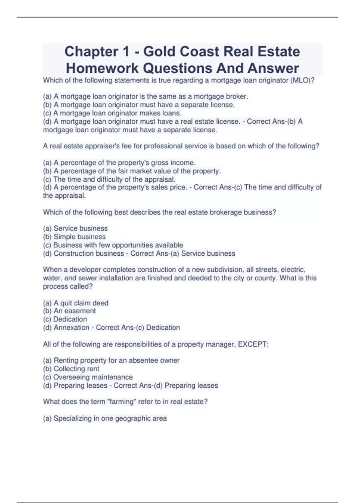 Chapter 1 - Gold Coast Real Estate Homework Questions And Answer Which of the following statements is true regarding a mortgage loan originator (MLO)? (a) A mortgage loan originator is the same as a mortgage broker. (b) A mortgage loan originator must have a separate license. (c) A mortgage loan originator makes loans. (d) A mortgage loan originator must have a real estate license. - Correct Ans-(b) A mortgage loan originator must have a separate license. A real estate appraiser's fee for professional service is based on which of the following? (a) A percentage of the property's gross income. (b) A percentage of the fair market value of the property. (c) The time and difficulty of the appraisal. (d) A percentage of the property's sales price. - Correct Ans-(c) The time and difficulty of the appraisal. Which of the following best describes the real estate brokerage business? (a) Service business (b) Simple business (c) Business with few opportunities available (d) Construction business - Correct Ans-(a) Service business When a developer completes construction of a new subdivision, all streets, electric, water, and sewer installation are finished and deeded to the city or county. What is this process called? (a) A quit claim deed (b) An easement (c) Dedication (d) Annexation - Correct Ans-(c) Dedication All of the following are responsibilities of a property manager, EXCEPT: (a) Renting property for an absentee owner (b) Collecting rent (c) Overseeing maintenance (d) Preparing leases - Correct Ans-(d) Preparing leases What does the term "farming" refer to in real estate? (a) Specializing in one geographic area (b) Working in a cooperative manner (c) Specializing in agricultural properties (d) Specializing in the sales of orange groves or cattle farms - Correct Ans-(a) Specializing in one geographic area Which insurance policies can a real estate licensee offer to the public without additional state licensing? (a) Flood insurance (b) Fire insurance (c) Renter's insurance (d) None of the above - Correct Ans-(d) None of the above What is the purpose of the National Association of REALTORS®? (a) Preserve the right of individuals to own real property through an exchange of information. (b) Organize antigovernment activities. (c) Promote unethical practice of real estate professionals. (d) Award unearned educational designations. - Correct Ans-(a) Preserve the right of individuals to own real property through an exchange of information What does the designation of REALTOR® signify CONTINUES.....