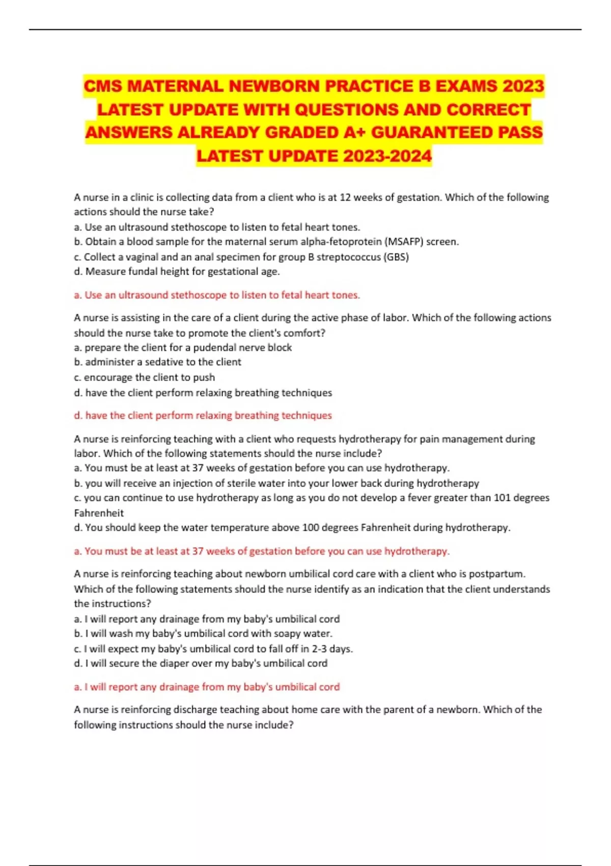 CMS MATERNAL NEWBORN PRACTICE B EXAMS 2023 LATEST UPDATE WITH QUESTIONS AND CORRECT ANSWERS ALREADY GRADED A+ GUARANTEED PASS LATEST UPDATE