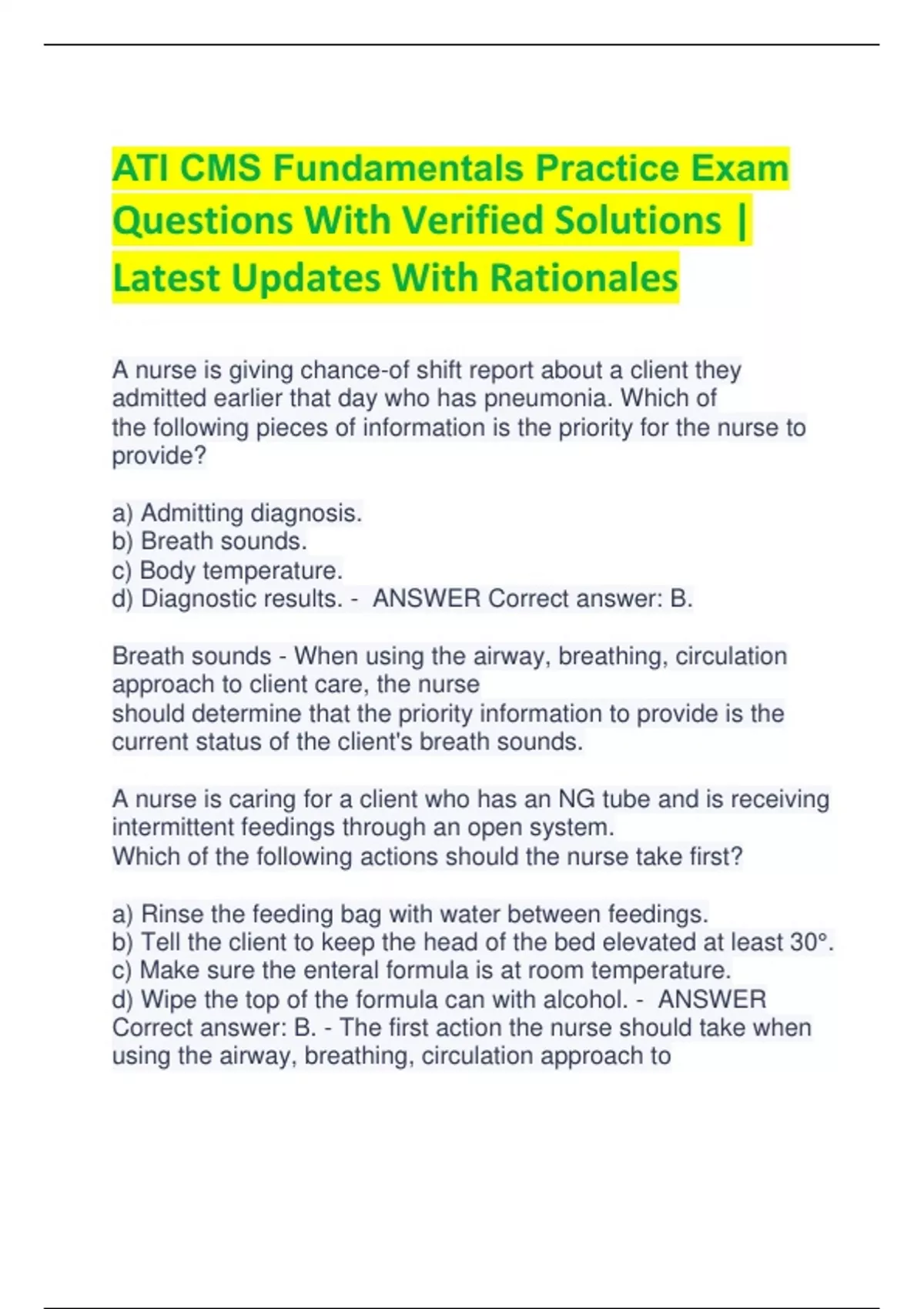 ATI CMS Fundamentals Practice Exam Questions With Verified Solutions | Latest Updates With Rationales A nurse is giving chance-of shift report about a client they admitted earlier that day who has pneumonia. Which of the following pieces of information is the priority for the nurse to provide? a) Admitting diagnosis. b) Breath sounds. c) Body temperature. d) Diagnostic results. - ANSWER Correct answer: B. Breath sounds - When using the airway, breathing, circulation approach to client care, the nurse should determine that the priority information to provide is the current status of the client's breath sounds. A nurse is caring for a client who has an NG tube and is receiving intermittent feedings through an open system. Which of the following actions should the nurse take first? a) Rinse the feeding bag with water between feedings. b) Tell the client to keep the head of the bed elevated at least 30°. c) Make sure the enteral formula is at room temperature. d) Wipe the top of the formula can with alcohol. - ANSWER Correct answer: B. - The first action the nurse should take when using the airway, breathing, circulation approach to client care is to prevent aspiration of the enteral formula; therefore, the priority intervention is to keep the head of the bed elevated at least 30° to prevent reflux of the formula into the esophagus A nurse is caring for a client who has tuberculosis. Which of the following actions should the nurse take? a) Place the client in a room with negative-pressure airflow b) Wear gloves when assisting the client with oral care. c) Limit each visitor to 2-hr increments. d) Wear a surgical mask when providing client care. e) Use antimicrobial sanitizer for hand hygiene - ANSWER Correct answer: A, B, E. - Place the client in a room with negative-pressure airflow is correct. The nurse should place the client in a room with negative-pressure airflow to meet the requirements of airborne precautions. Wear gloves when assisting the client with oral care is correct. The nurse should wear gloves when assisting the client with oral care to meet the requirements of standard precautions, which the nurse must adhere to for all clients regardless of their diagnosis. The nurse should wear gloves whenever their hands might come in contact with a client's bodily fluids, such as saliva, and the mucous membranes in the mouth. Limit each visitor to 2- hr increments is incorrect. The nurse does not need to limit the client's visitors. However, the nurse should limit the client's presence outside the room and the client should wear a surgical mask when outside of the room. Wear a surgical mask when providing client care is incorrect. The nurse should wear an N95 respirator during A nurse is performing a Romberg test during a physical assessment of a client. Which of the following techniques should the nurse use? a) Touch the face with a cotton ball. b) Apply a vibrating tuning fork to the client's forehead. c) Have the client stand with their arms at their sides and their feet together. d) Perform direct percussion over the area of the kidneys. - ANSWER Correct answer: C - A Romberg test helps identify alterations in balance. The nurse should have the client stand with their arms at their sides and their feet together to observe for swaying and a loss of balance. To obtain an accurate blood pressure measurement, - ANSWER the nurse should inflate the cuff 30 mm Hg beyond the point at which the nurse was last able to palpate the pulse. If the nurse last palpated the pulse at 92 mm Hg, then this would be the correct pressure to which the nurse should inflate the cuff. The nurse has accepted a verbal prescription "for three tenths of a milligram of levothyroxine IV stat" for a client who has myxedema coma. How should the nuse transcribe the dosage of this medication in the medical record? a) .3 mg b) 0.3 mg c) 0.30 mg d) 3/10 mg - ANSWER Correct answer: B - The use and placement of a decimal point can potentially cause a medication error if documented incorrectly. A zero should precede a decimal point, as in 0.3 mg, but should not follow a decimal point unless a whole number follows the zero, as in 2.05 mg A nurse is discussing the use of herbal supplements for health promotion with a client. Which of the following client statements indicates an understanding of herbal supplement use? a) "I can take echinacea to improve my immune system." b) "I can take feverfew to reduce my level of anxiety." c) "I can take ginger to improve my memory." d) "I can take ginkgo biloba to relieve nausea." - ANSWER Correct answer: A.- Echinacea is taken to promote immunity and reduce the risk of infection. Feverfew is taken to promote wound healing and decrease inflammation associated with arthritis. Valerian and chamomile can be taken to reduce anxiety. Ginger is taken to relieve nausea and vomiting and aid in digestion. Ginkgo biloba can be taken to improve memory and reduce stress. Ginkgo biloba is taken to improve memory and reduce stress. Ginger can be taken to relieve nausea and vomiting and aid in digestion. A nurse is caring for a client who has decreased mobility. Which of the following actions should the nurse take t decrease the client's risk of developing plantar flexion contractures? a) Place a pillow under the client's