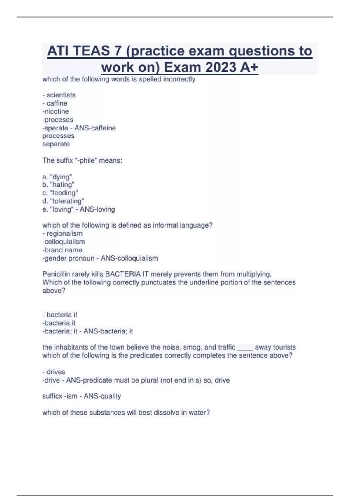 ATI TEAS 7 (practice exam questions to work on) Exam 2023 A+ which of the following words is spelled incorrectly - scientists - caffine -nicotine -proceses -sperate - ANS-caffeine processes separate The suffix "-phile" means: a. "dying" b. "hating" c. "feeding" d. "tolerating" e. "loving" - ANS-loving which of the following is defined as informal language? - regionalism -colloquialism -brand name -gender pronoun - ANS-colloquialism Penicillin rarely kills BACTERIA IT merely prevents them from multiplying. Which of the following correctly punctuates the underline portion of the sentences above? - bacteria it -bacteria,it -bacteria; it - ANS-bacteria; it the inhabitants of the town believe the noise, smog, and traffic ____ away tourists which of the following is the predicates correctly completes the sentence above? - drives -drive - ANS-predicate must be plural (not end in s) so, drive sufficx -ism - ANS-quality which of these substances will best dissolve in water? CONTINUES...