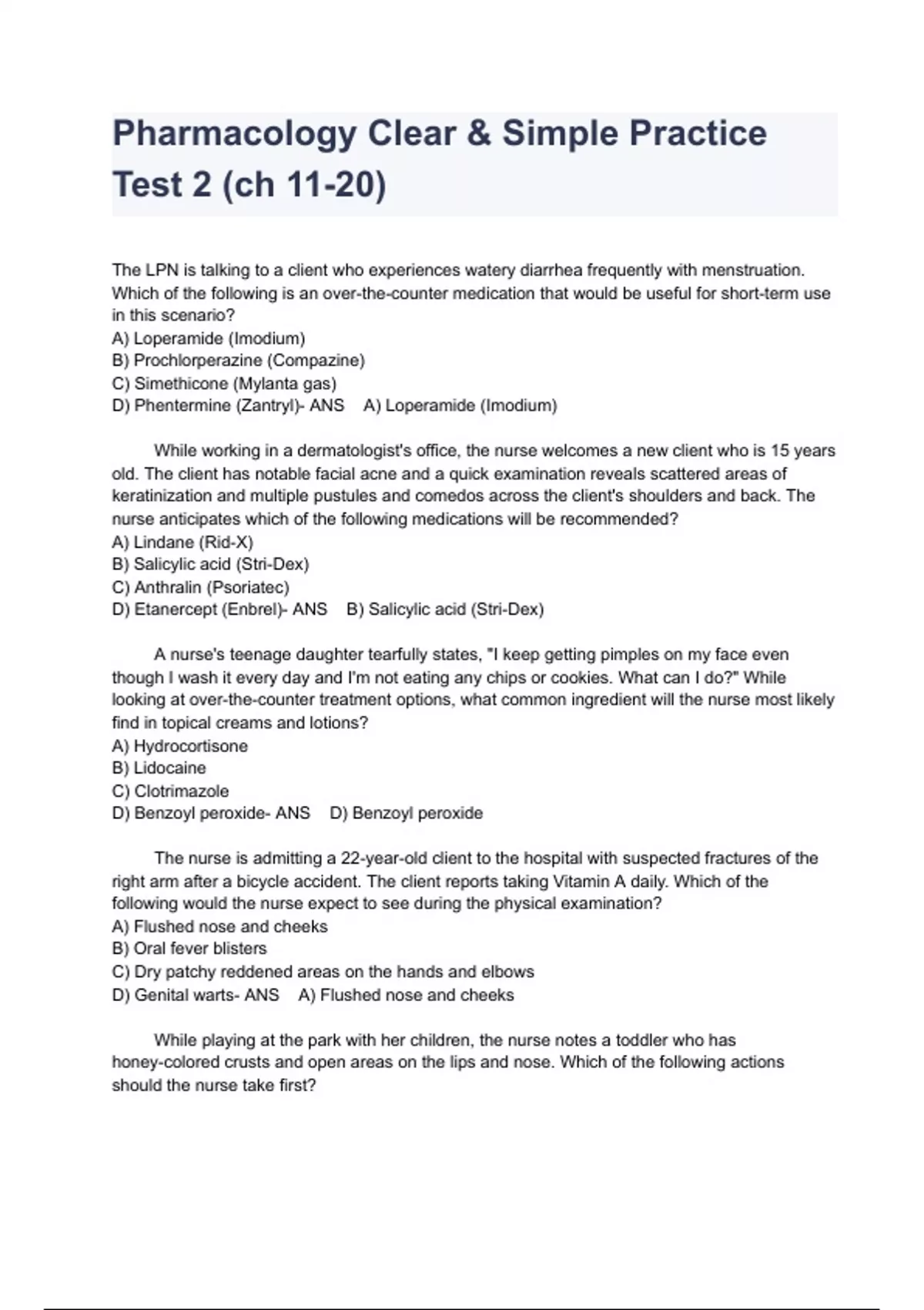 Pharmacology Clear & Simple Practice Test 2 (ch 11-20) The LPN is talking to a client who experiences watery diarrhea frequently with menstruation. Which of the following is an over-the-counter medication that would be useful for short-term use in this scenario? A) Loperamide (Imodium) B) Prochlorperazine (Compazine) C) Simethicone (Mylanta gas) D) Phentermine (Zantryl)- ANS A) Loperamide (Imodium) While working in a dermatologist's office, the nurse welcomes a new client who is 15 years old. The client has notable facial acne and a quick examination reveals scattered areas of keratinization and multiple pustules and comedos across the client's shoulders and back. The nurse anticipates which of the following medications will be recommended? A) Lindane (Rid-X) B) Salicylic acid (Stri-Dex) C) Anthralin (Psoriatec) D) Etanercept (Enbrel)- ANS B) Salicylic acid (Stri-Dex) A nurse's teenage daughter tearfully states, "I keep getting pimples on my face even though I wash it every day and I'm not eating any chips or cookies. What can I do?" While looking at over-the-counter treatment options, what common ingredient will the nurse most likely find in topical creams and lotions? A) Hydrocortisone B) Lidocaine C) Clotrimazole D) Benzoyl peroxide- ANS D) Benzoyl peroxide The nurse is admitting a 22-year-old client to the hospital with suspected fractures of the right arm after a bicycle accident. The client reports taking Vitamin A daily. Which of the following would the nurse expect to see during the physical examination? A) Flushed nose and cheeks B) Oral fever blisters C) Dry patchy reddened areas on the hands and elbows D) Genital warts- ANS A) Flushed nose and cheeks While playing at the park with her children, the nurse notes a toddler who has honey-colored crusts and open areas on the lips and nose. Which of the following actions should the nurse take first? A) No action is required as the child is exhibiting symptoms of a common cold and medications will not alter the child's symptoms. B) Ask the child's parent if the child has food allergies and suggest the use of an antihistamine. C) Inform the child's parent the child may have a common bacterial infection and should be seen by a physician for topical or systemic antibiotics. D) Suggest the child's parent seek treatment for suspected thrush with an oral antifungal agent.- ANS C) Inform the child's parent the child may have a common bacterial infection and should be seen by a physician for topical or systemic antibiotics. A nurse working for a family practice physician sees a 48-year-old client who reports severe itching of his hands and under arms. Examination reveals redness and irritation in the webbing of both hands and axillae. The physician orders permethrin (Elimite) cream, a scabicide. The nurse recognizes treatment has been effective by which of the following statements? A) "I can't believe I have lice. I wonder if I got it from my niece." B) "So applying this cream between my fingers and arm pits will kill the mites and eggs." C) "I will need to use a fine-tooth comb to go through my hair daily for the next full week." D) "Scabies only live on top of the skin, so the itch should disappear within a day."- ANS B) "So applying this cream between my fingers and arm pits will kill the mites and eggs." A nursing instructor informs a nursing student that the assigned client has been prescribed a pediculicide medication. The student recognizes the client has been diagnosed with which of the following? A) Lice B) Psoriasis C) Impetigo D) Malignant melanoma- ANS A) Lice The nurse is providing instructions for a client newly that will begin taking docosanol 10% (Abreva) for HSV-1 infection. Which of the following instructions indicates further teaching is necessary? A) "Side effects of this medication could be headache or nasal congestion." B) "I should apply this medication once daily." C) "I don't need a prescription for this medication." D) "The medication helps shorten how long I'll have symptoms because it blocks the spread of the virus."- ANS B) "I should apply this medication once daily." A nurse working in the gynecology office is asked to assist in the treatment of a client with condylomas. Which of the following actions should the nurse take? A) Prepare the client for full-body phototherapy. B) Ask the client if there are any known allergies to iodine. C) Make a list of the client's sexual partners for the past 3 weeks. D) Assist the client to remove their clothing below the waist.- ANS D) Assist the client to remove their clothing below the waist.