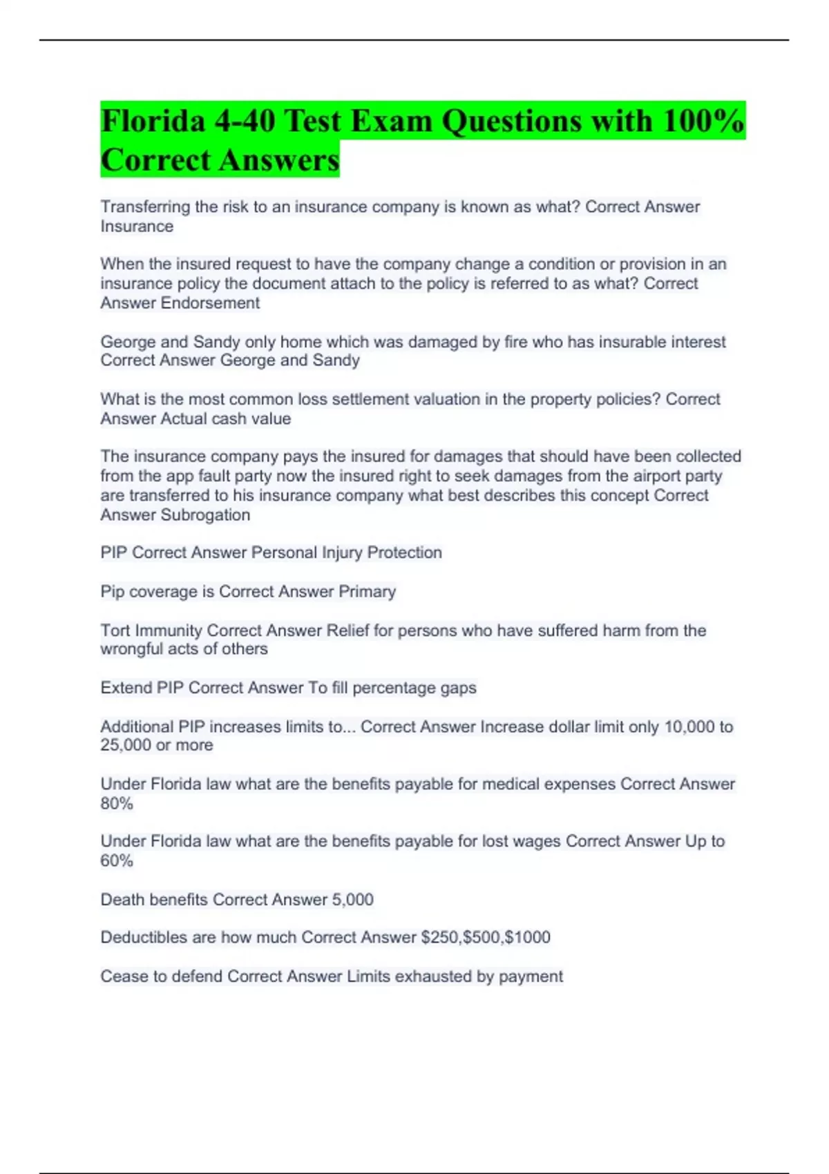 Under Florida law what are the benefits payable for medical expenses Correct Answer 80%