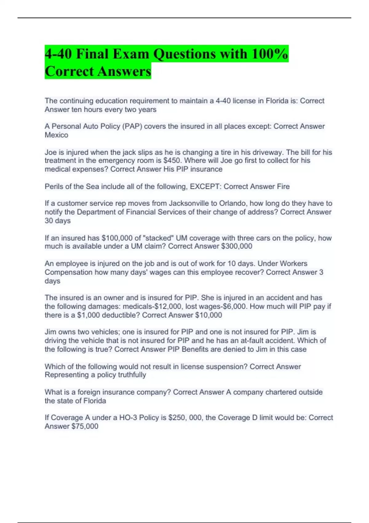 The continuing education requirement to maintain a 4-40 license in Florida is: Correct Answer ten hours every two years A Personal Auto Policy (PAP) covers the insured in all places except: Correct Answer Mexico Joe is injured when the jack slips as he is changing a tire in his driveway. The bill for his treatment in the emergency room is $450. Where will Joe go first to collect for his medical expenses? Correct Answer His PIP insurance Perils of the Sea include all of the following, EXCEPT: Correct Answer Fire If a customer service rep moves from Jacksonville to Orlando, how long do they have to notify the Department of Financial Services of their change of address? Correct Answer 30 days If an insured has $100,000 of "stacked" UM coverage with three cars on the policy, how much is available under a UM claim? Correct Answer $300,000 An employee is injured on the job and is out of work for 10 days. Under Workers Compensation how many days' wages can this employee recover? Correct Answer 3 days The insured is an owner and is insured for PIP. She is injured in an accident and has the following damages: medicals-$12,000, lost wages-$6,000. How much will PIP pay if there is a $1,000 deductible? Correct Answer $10,000 Jim owns two vehicles; one is insured for PIP and one is not insured for PIP. Jim is driving the vehicle that is not insured for PIP and he has an at-fault accident. Which of the following is true? Correct Answer PIP Benefits are denied to Jim in this case Which of the following would not result in license suspension? Correct Answer Representing a policy truthfully What is a foreign insurance company? Correct Answer A company chartered outside the state of Florida If Coverage A under a HO-3 Policy is $250, 000, the Coverage D limit would be: Correct Answer $75,000